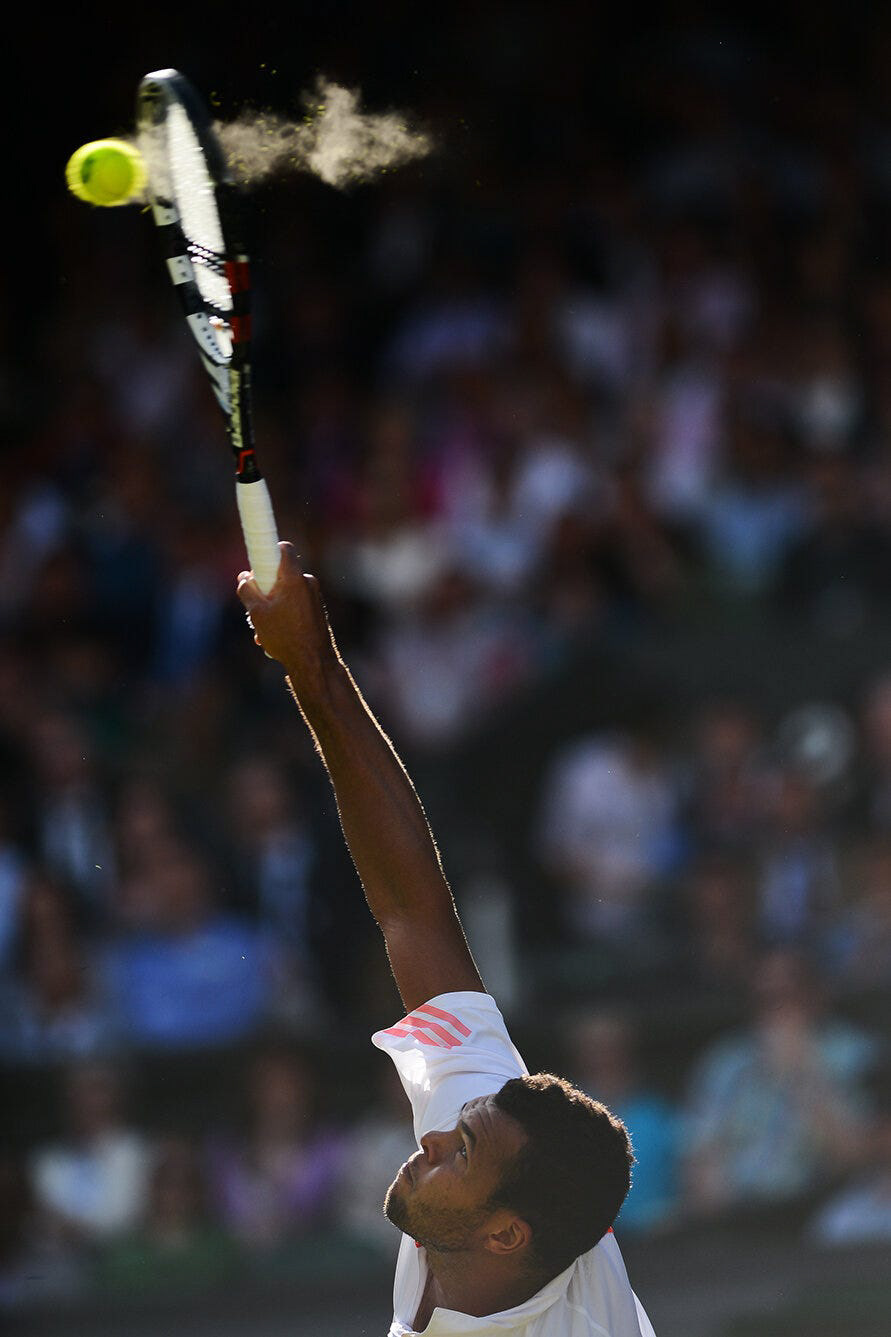 Now that the Diamond Jubilee was tucked up safely in history, it was time for the sport to begin. The Olympics loomed large but first up was the matter of Wimbledon. With so many photographers covering the big matches, it sometimes seems as though there’s nothing that you can do that feels different. The agencies covering the fortnight have teams of photographers and editors covering every game from every angle. One of the few things that can change things is the light. With the sun going down and the backgrounds dropping down to lovely photogenic “blackgrounds”, I noticed that the briefest of puffs of dust was visible every time Tsonga served with a fresh ball. Knowing it wasn’t an everyday shot, I settled in to spend a bit of time trying to catch it but thankfully managed to get it on my second chance.