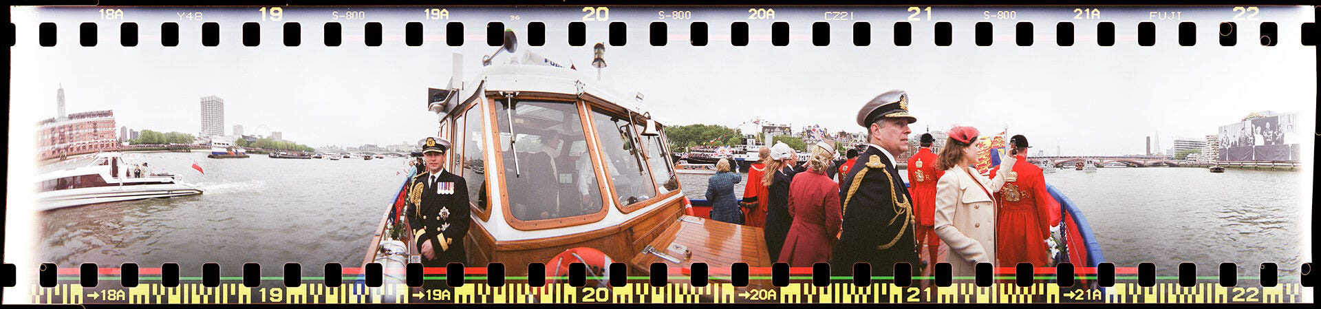 Away from the up-close and personal portrait above, the following picture allowed me to try to capture how it was to be on the Thames that day. While Princess Eugenie, Sophie Wessex and other members of the Royal family wave to people on the bank, Prince Andrew looks towards the giant portrait of the Royal family that was hung from a building and Prince Edward just wonders what the hell I’m doing, as I crouch on the deck and fire what looks like a distress flare but is in fact a Lomography Spinner 360. An exceptionally bizarre day.