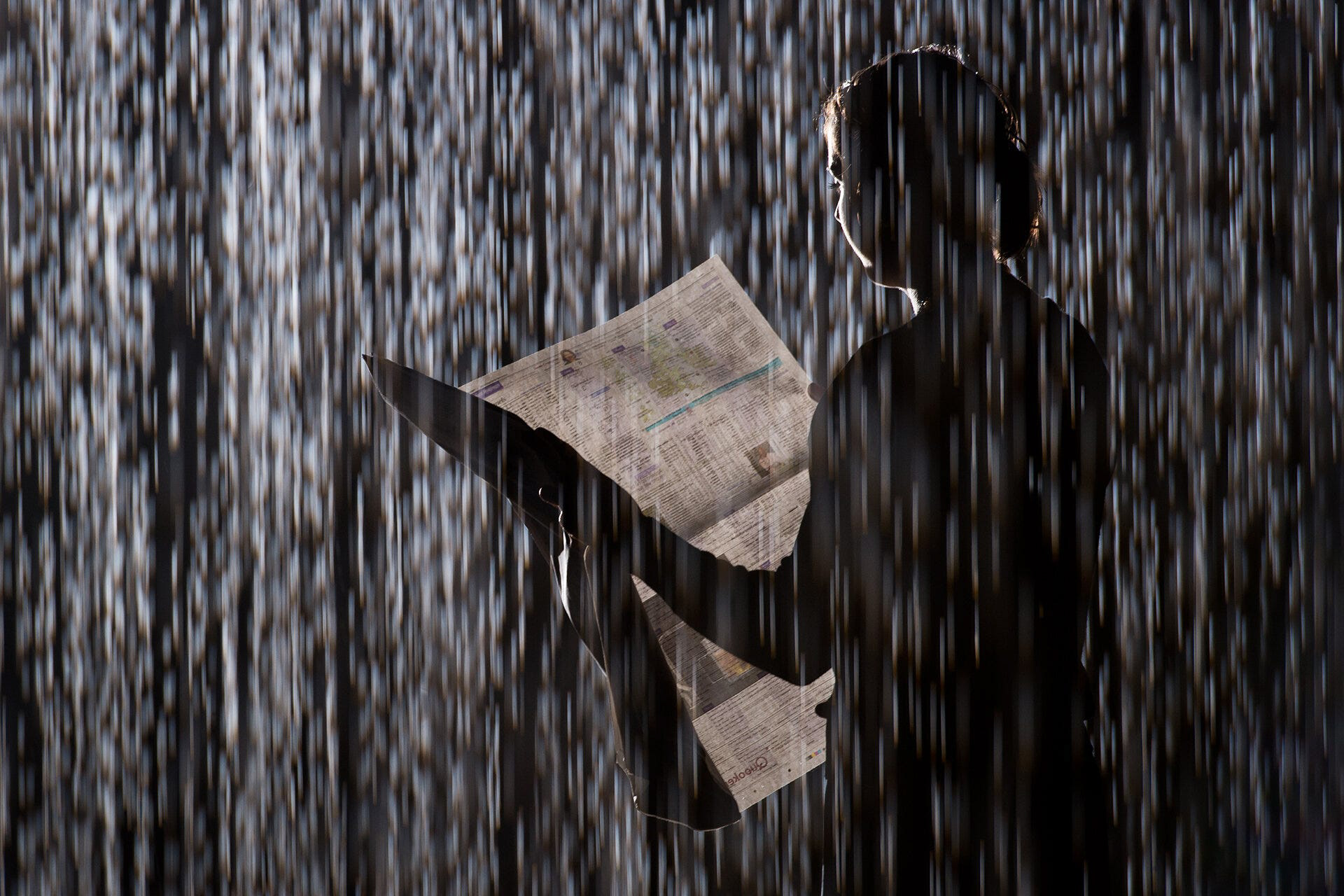 The Rain Room was another assignment that could have produced good pictures if any photographer had closed their eyes and pointed the camera towards the splashing sounds. However, catching something a bit different was the challenge for me and I think I got it with this one. With the whole point of the installation being that a person can walk through an apparent rain storm without getting wet, I wanted to indicate this to the viewer so grabbed a copy of a newspaper from the gallery staffroom and posed up a technician in the middle of the shower.