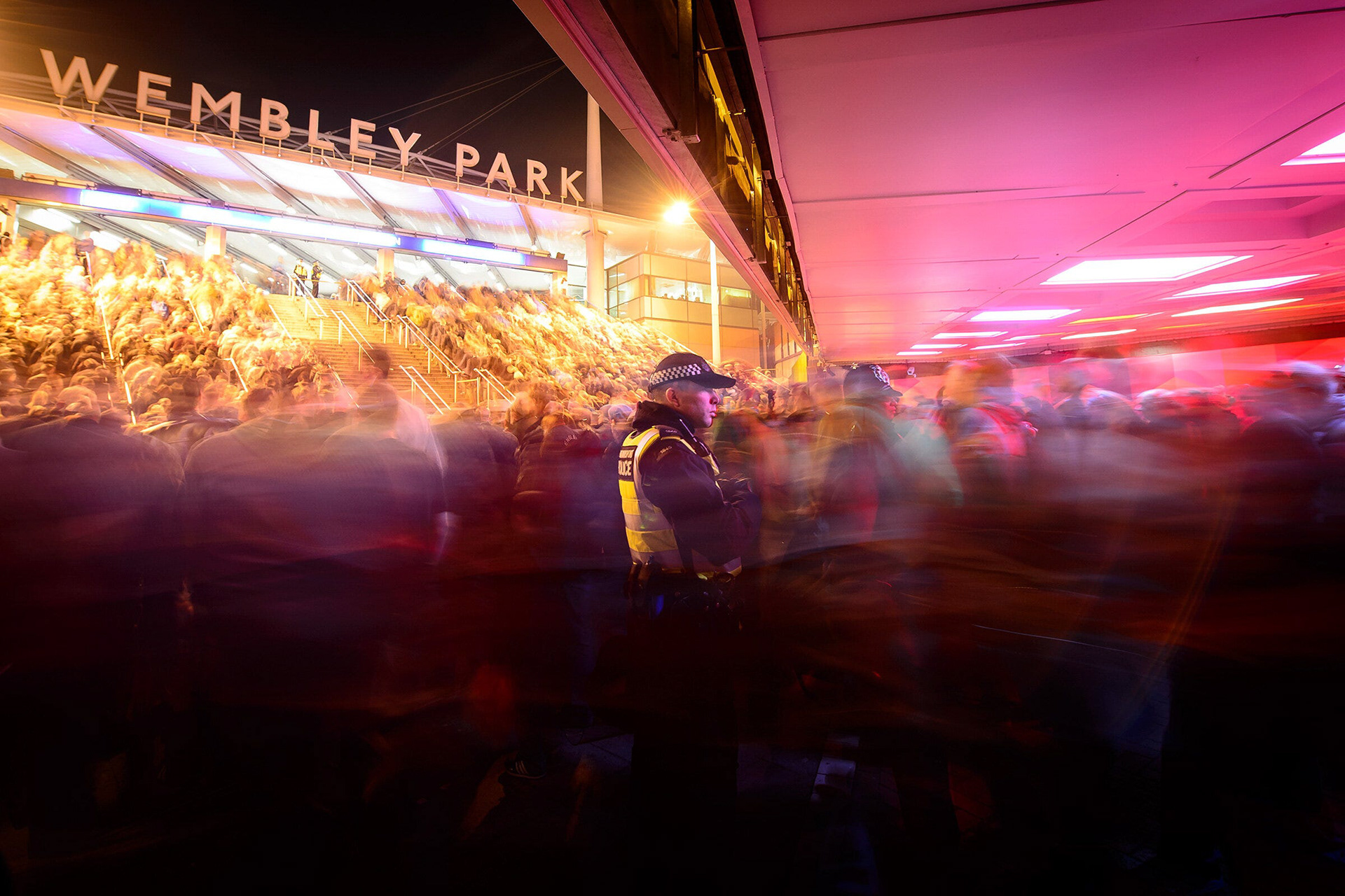 There are some jobs that can prove a real work-out, regarding creative thoughts and spending a full 8 hour shift on the 600m pavement that is Olympic Way, shooting fan features during the England v Poland match is one of them. As I’d shot them arriving and leaving, my job was done and I was heading towards my bike when I spotted the potential in the flow of thousands of fans rushing towards Wembley Park station. Previously, I’d seen some great shots from the top of the bridge looking towards Wembley, but I hadn’t seen one from ground level.