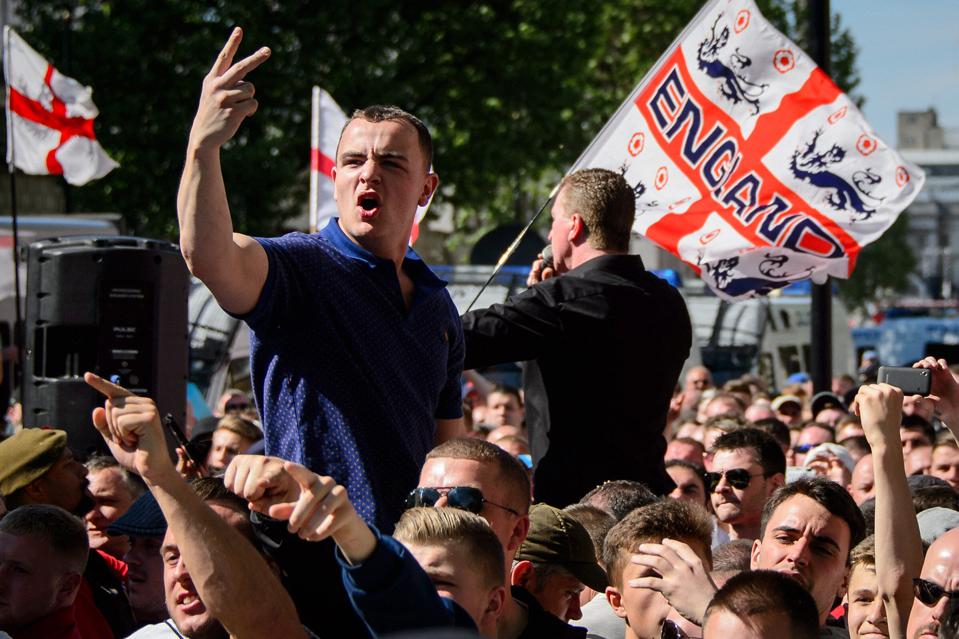 From religious wonder to just wonder. A nice day out to Westminster from members of the EDL right wing group ended up, surprisingly, with a bit of a kerfuffle. Here, a representative of the group waves to a nearby friend. Probably.