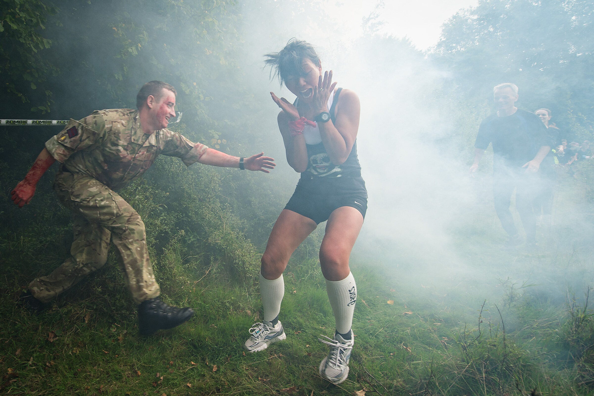 Another choice is this moment from the Zombie Evacuation Race in Saffron Walden. As the participants made their way into an area of thick undergrowth, the sound of a growling chainsaw could be heard in the bushes. Combined with the smoke, it really wasn’t somewhere that you want to go but the armed soldier barking orders at the head of the path made it clear there was no option. Edging your way down the path, a soldier who was only supposed to be marshalling on the day decided he wanted to have a bit of fun. The resulting scream from this runner was an absolute belter. When you watch horror films, you always doubt that people do all of the stereotypical things, but she really did go for the full 1960’s horror flick scream, complete with hands to the face. Brilliant.