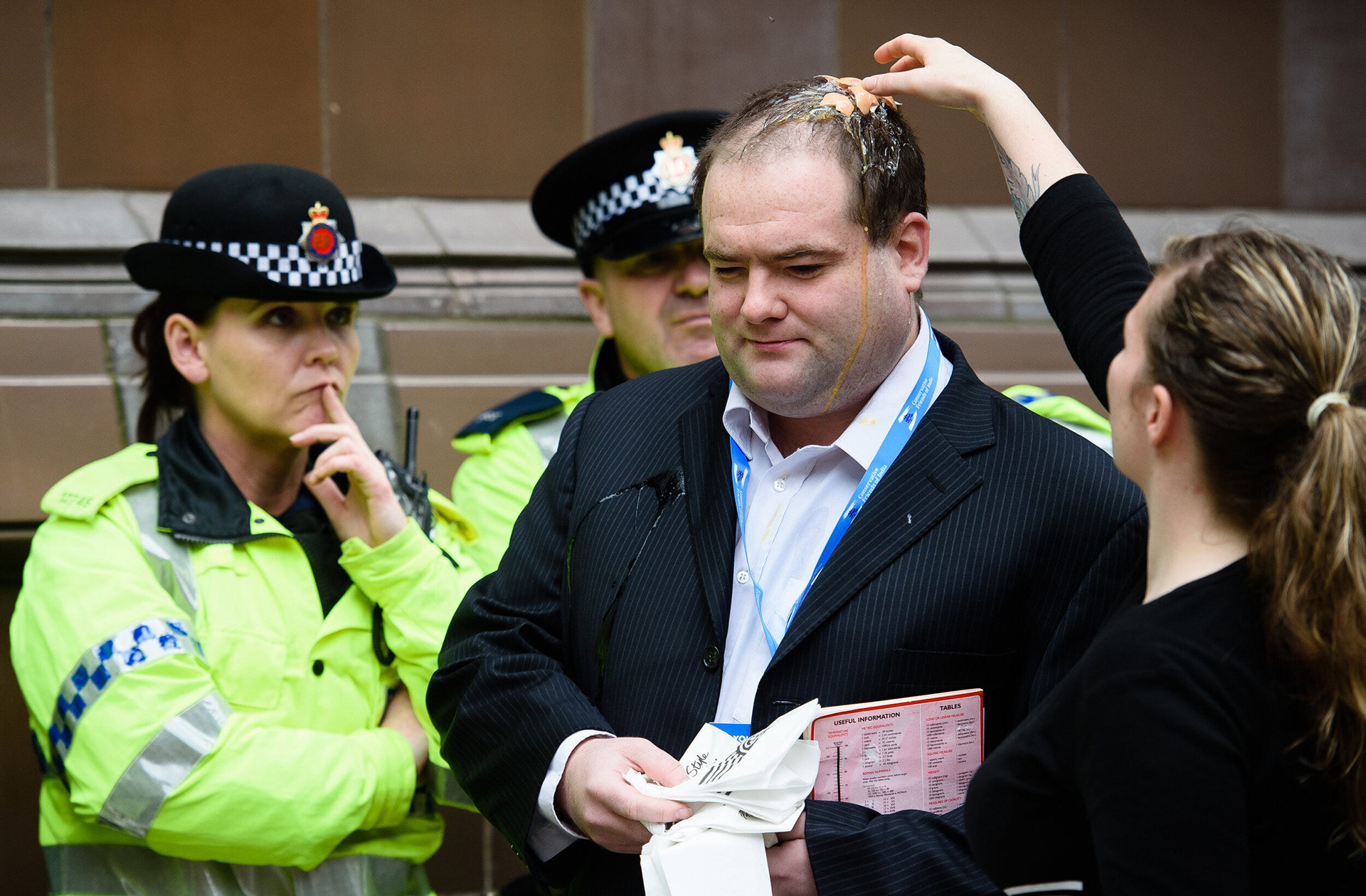 Moving up north to Manchester for the Conservative conference, the locals made delegates feel welcome with a traditional Mancunian volley of shelled farm produce. After seeing a strong series of pictures from the previous day where what can only be described as a BBC central casting “Toff” got a face full of yolk, I assumed that my chances of catching anything similar were pretty low. However, while covering comings and goings, I heard shouting and found a female hotel worker helping to remove the remains of an albumenic attack from the head of a delegate. As happened with the image above of the police officer at Wimbledon, some online commentators, including a well-known “columnist” *cough* chose to attack the police for standing by while an evil woman broke an egg over the head of a delegate. Ah, why bother to read a caption, eh?