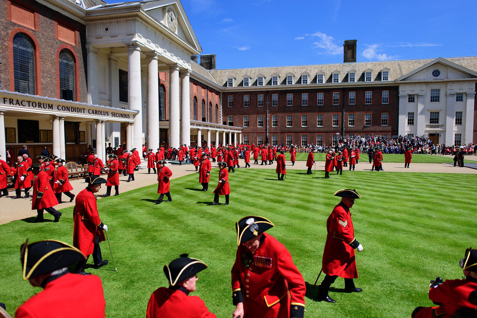 From silliness to respectability and the Founders Day Parade at the home of the Chelsea Pensioners, Chelsea Barracks. It was a sweltering day with clear blue skies so the colours were already popping and throughout the parade, it all looked as I was expecting. However, when the ceremony was over, everyone disbursed in all directions, creating this chaotic spray of colour.