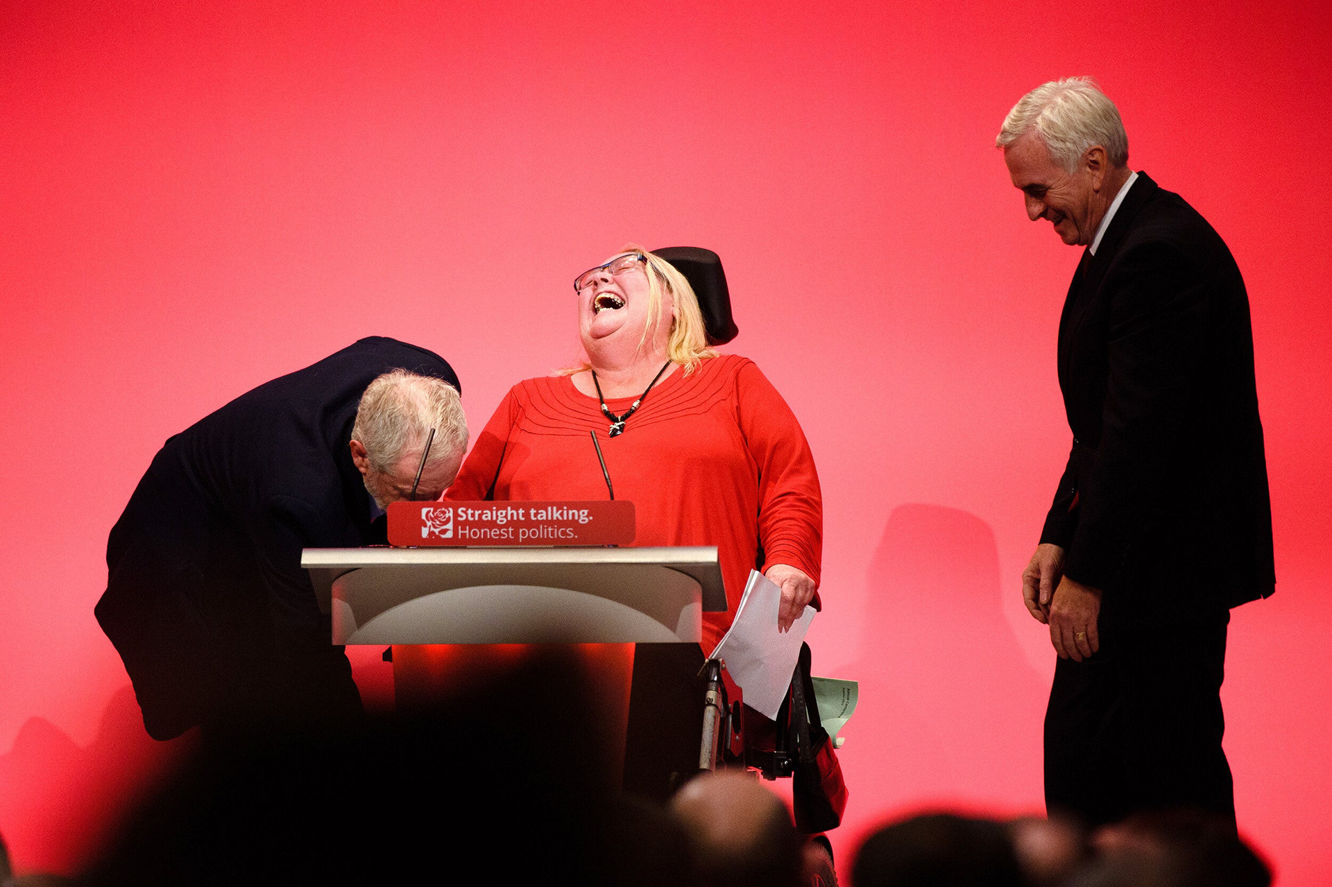 Next, a moment that could not be further from what would be allowed to happen at the Tory conference as is humanly possible. Newly elected Leader of the opposition Labour Party Jeremy Corbyn, and shadow chancellor John McDonnell, came to the aid of Labour councillor Candy Atherton who became stuck when her wheelchair became jammed under the adjustable lectern. Highlighting his technique of just getting on with things, no matter how it looks, he got right in there to look at the problem, much to Ms Atherton’s amusement.