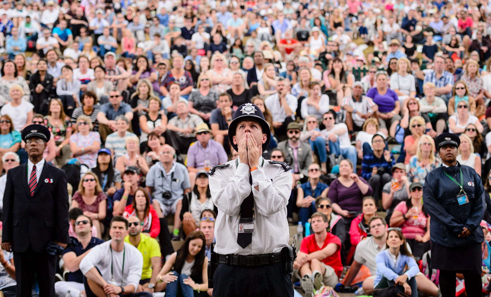 On the day of the Wimbledon men’s final, I was covering fan reactions on “Henman Hill/Murray Mound” when I spotted this policeman. Thoroughly lost in the game, he winced, grimaced and held his breath as the points were played. As is sadly expected these days, when it ran on a certain “newspaper” website, the comments included the all-too-predictable “Why are we paying for him to watch tennis?” and “Shouldn’t he be protecting us from terrorists?”. Personally, I was just really happy to see someone enjoying the moment.