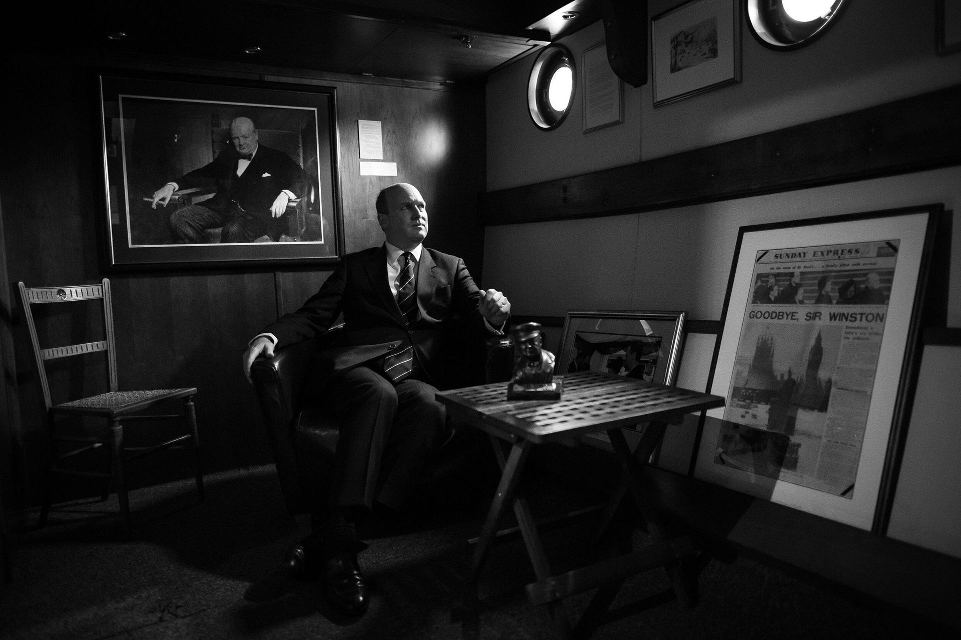 Below is a photo that I took on the Havengore, the survey vessel that carried former British Prime Minister Winston Churchill to his State funeral in 1965. As the fiftieth anniversary of his death drew closer, I was sent to make a portrait of Randolph Churchill, Winston’s Great-Grandson. Discovering the Churchill-themed room, I tried various ideas until I settled on shooting in totally ambient light. The final exposure was hand-held at 40th/sec at f1.8, with an ISO of 6400.