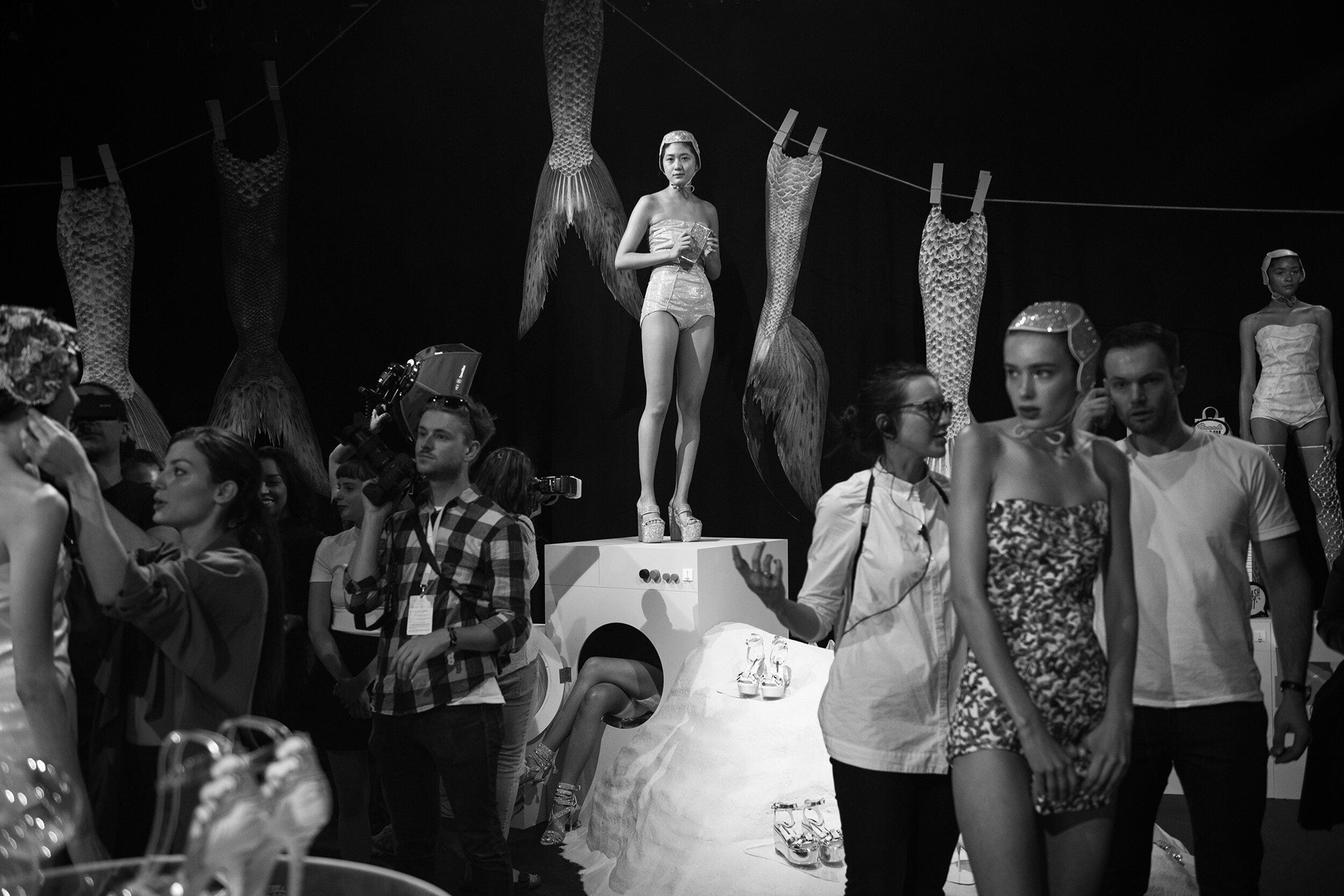Back in the world of fashion, a presentation by Sophia Webster featured an aquatic mermaid theme. Unlike a traditional catwalk show, this was styled like a living exhibition with models poking limbs out of various domestic utensils and reclining in giant clams. A brief moment during the set-up caught the buzz of the event for me.