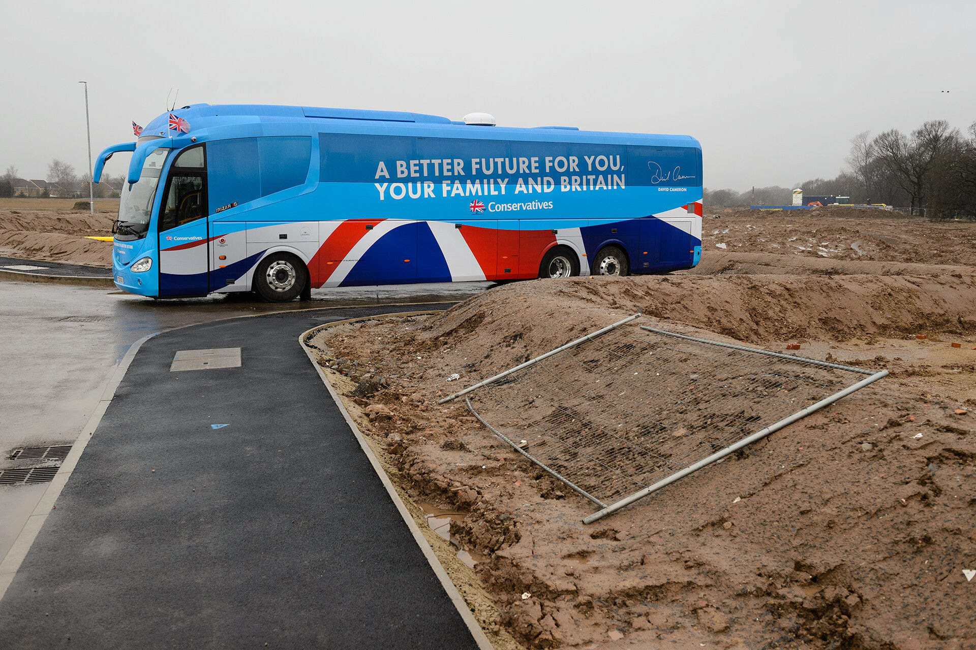 Due to a deal made between AFP, AP, Getty and Reuters, coverage from the Conservative battle bus was split into weekly chunks with me being chosen by AFP to take the first week. Life on the bus may not quite be what people think as during my week, I never travelled with the PM at any point, only ever meeting up with him at the planned events. Due to limited space, the media on board was small in numbers but still managed to include TV crews from Sky, ITN and the BBC, plus room for a couple of journalists and a total of three photographers. Remembering how to edit, caption and generally operate normally while facing backwards in a moving bus takes a day or two, but after a while, it’s life as normal.