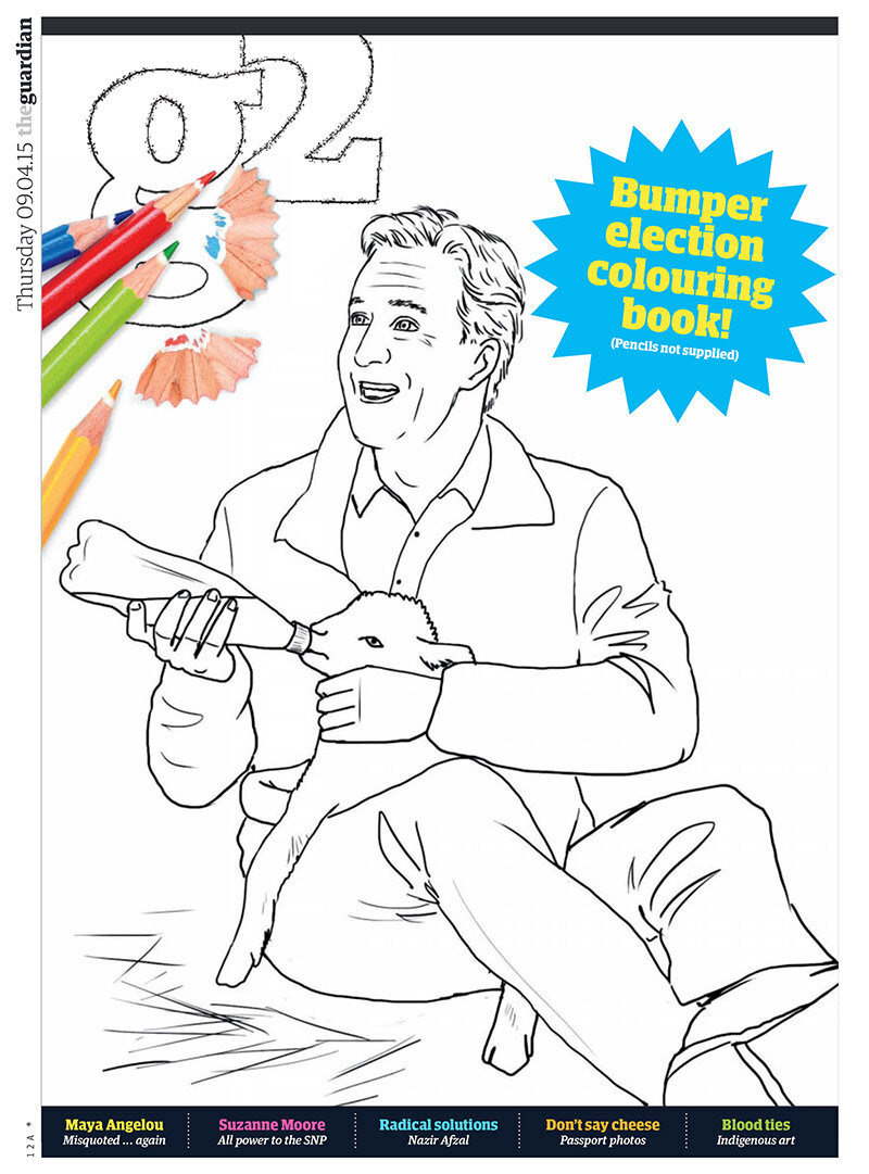 A good example of just letting the picture speak for itself was on the final day of my time on the bus, when we visited a farm near Spelsbury specialising in raising lambs which have been rejected by their mothers. The photo call was clearly very considered and planned by the media team, but probably due to Cameron’s rural upbringing, he was very comfortable handling the lambs so he didn’t seem out of place. The pictures provided ammunition for supporters through the mountains of metaphors (”caring for rejects”, “down-to-earth”, “not afraid to get down in the dirt” etc etc) while also proving a goldmine for satirists and meme-creators. In the latter version, it’s safe to say the lamb didn’t come out of the deal too well. Also, it’s not often one of my photos makes it into a colouring book.