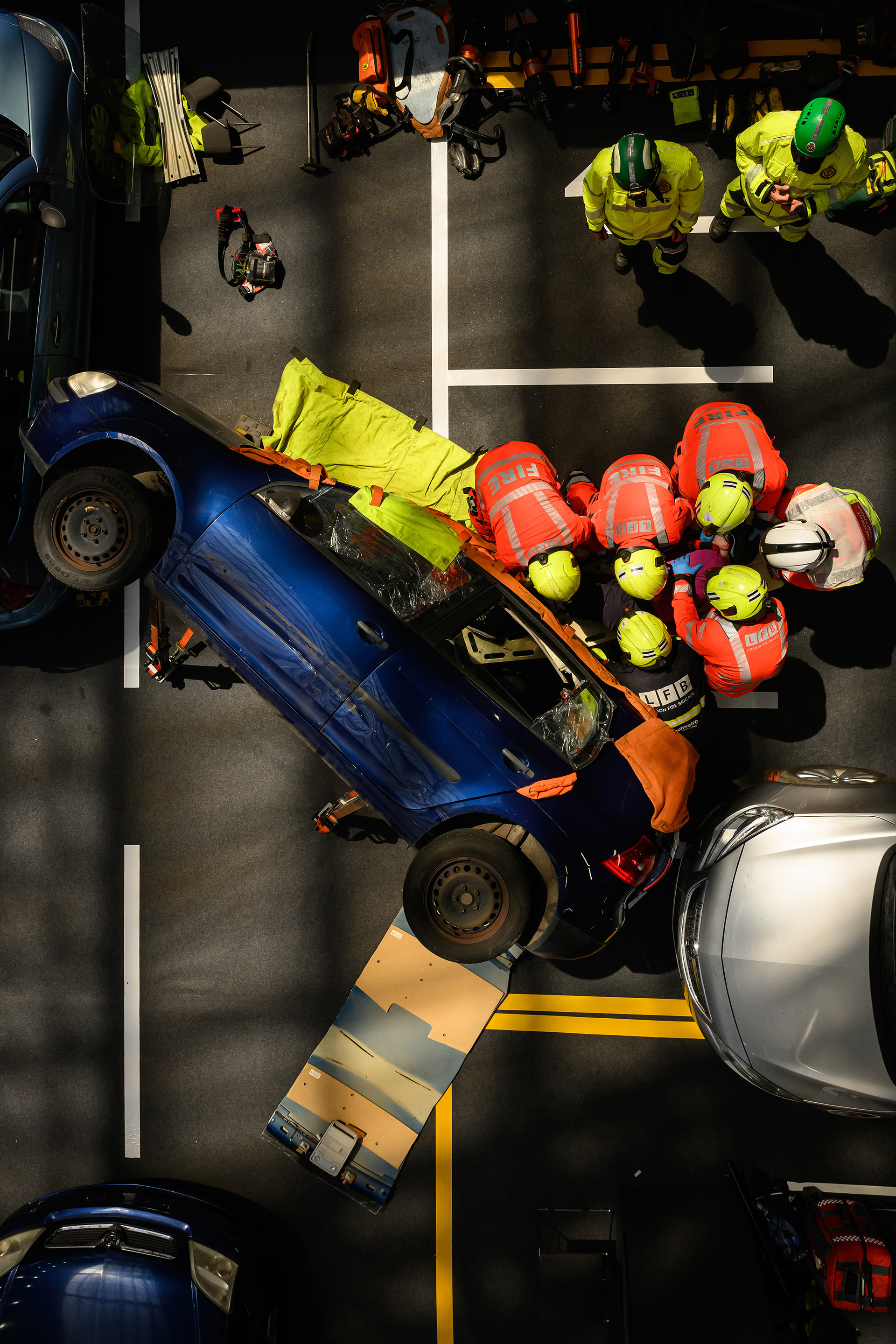 At the Blue Light emergency services exhibition, a demonstration of how to cut someone from a car was making decent photos until I spotted a closed stairway to a mezzanine above, letting me create a more abstract version of the procedure.