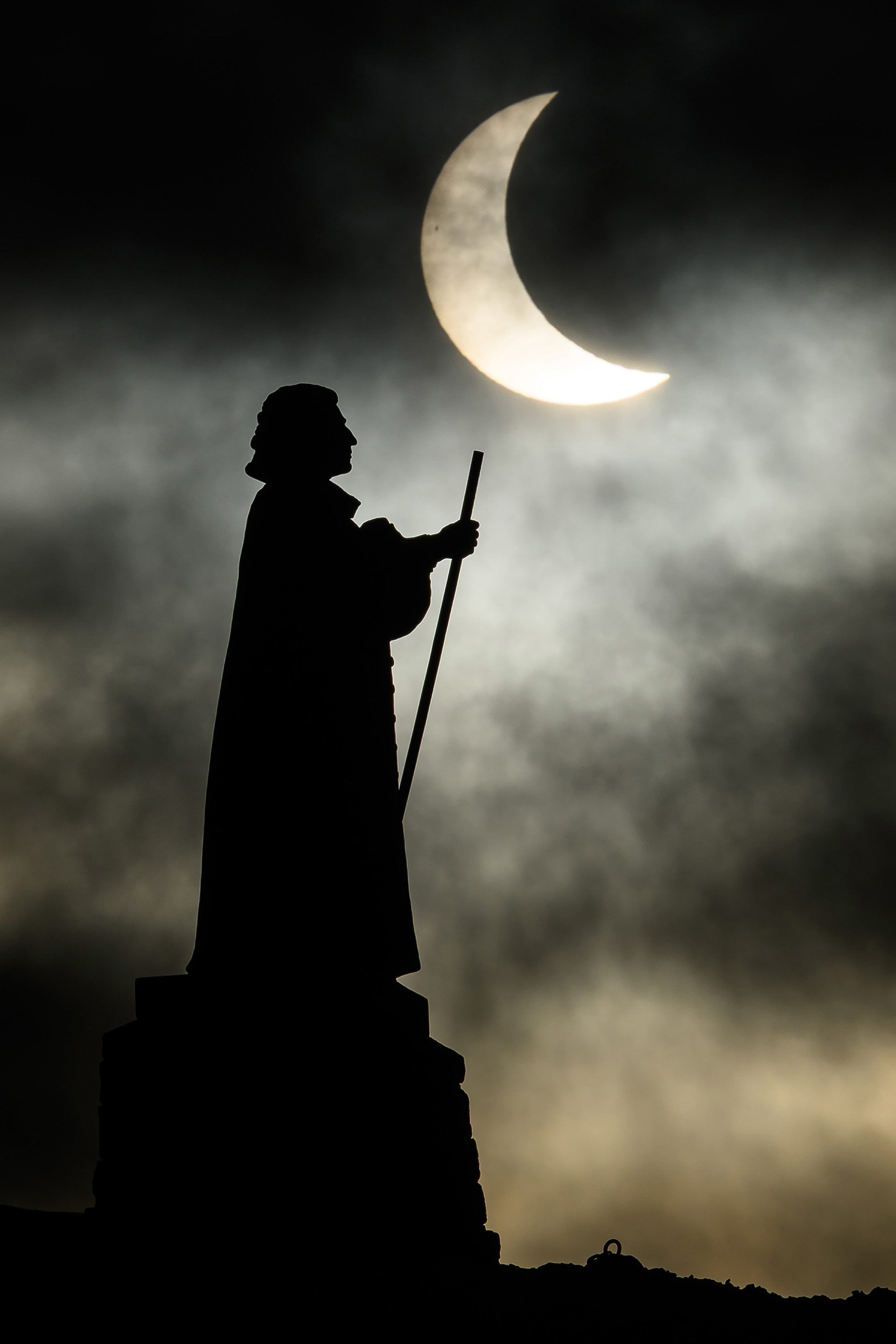 During my stay, I received an email, asking if I could give some thought to the upcoming partial solar eclipse. After a drive around looking for landmarks and shapes, and some plotting with a photography app, the clouds played ball and gave me this great moment.