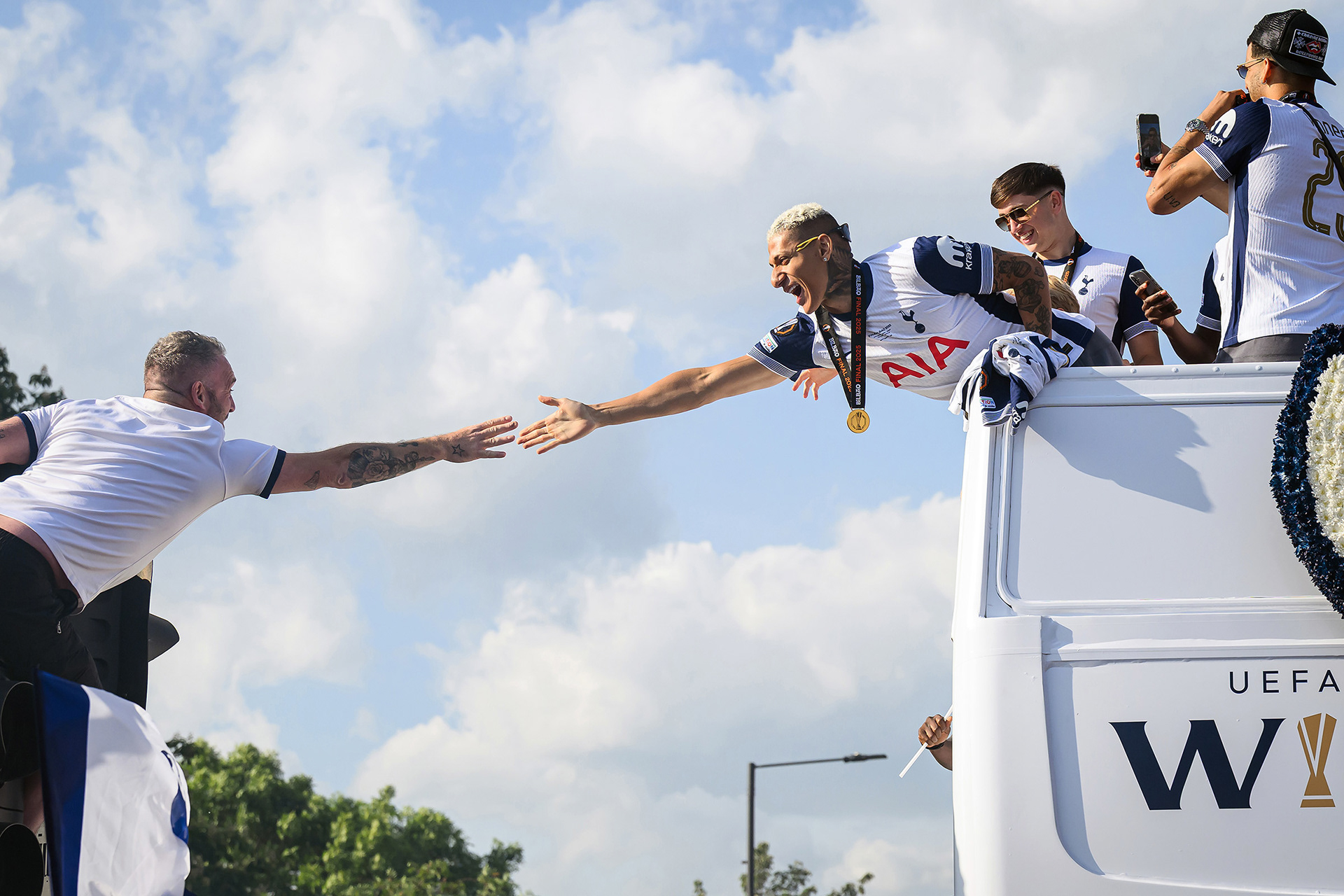 As you may well know, my knowledge of football is… well.. “slim”. The advantage of that is that when I was asked to cover the Spurs victory parade, I was just looking for moments and shapes rather than feeling that I had to follow any one particular player. Walking ahead of the bus, I saw a man sitting on a traffic light and realised that he’d be just about the right height to make contact if things went my way.