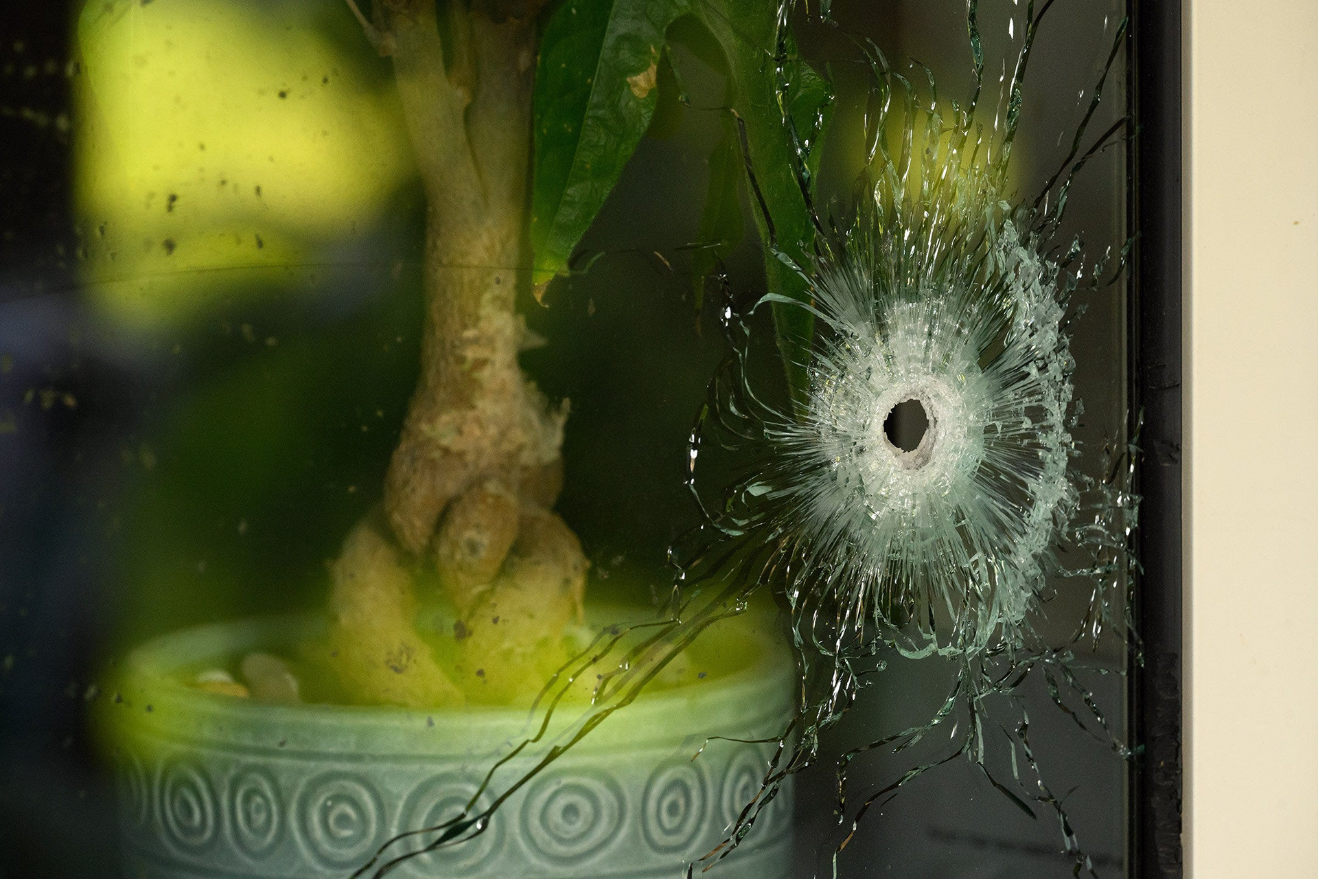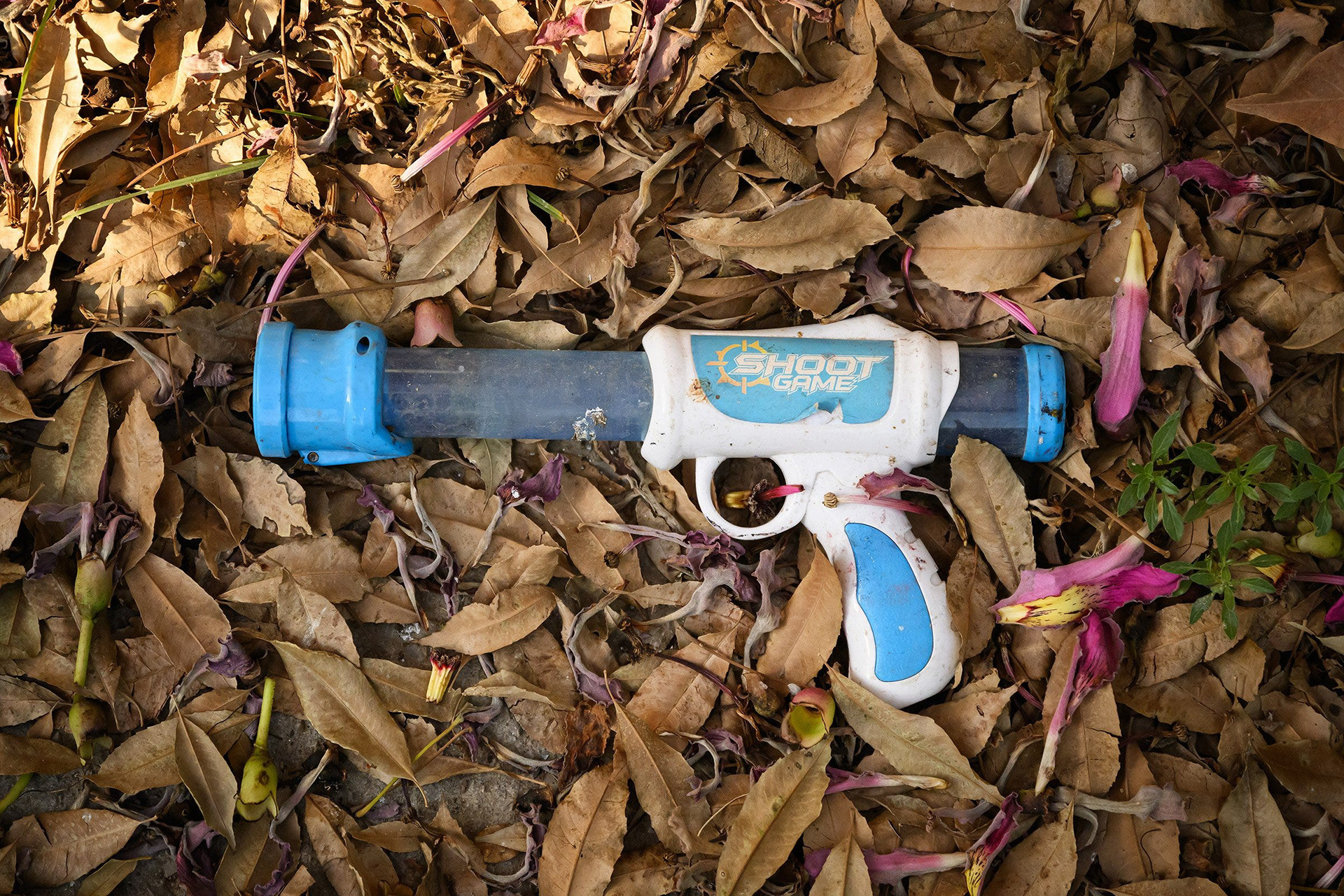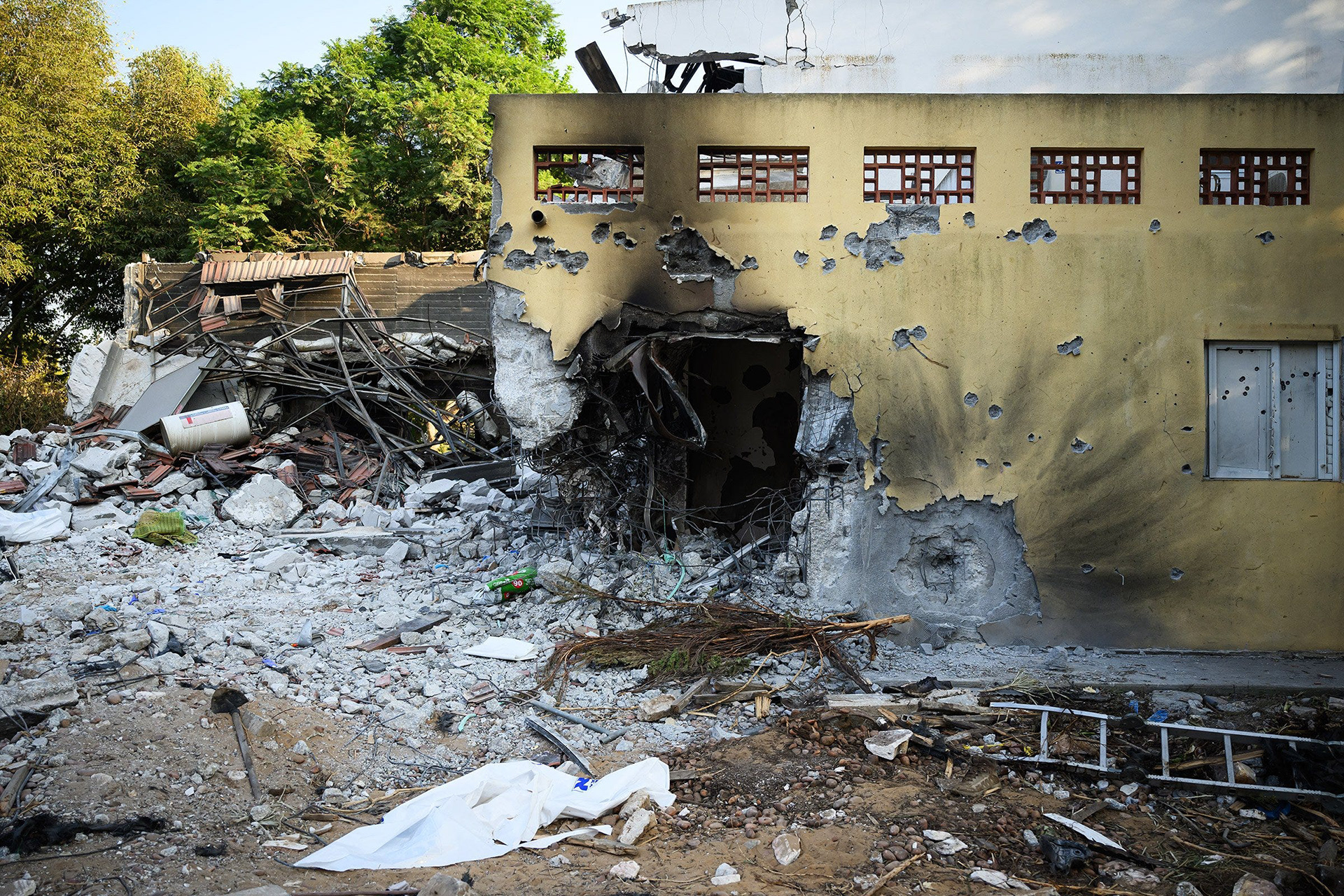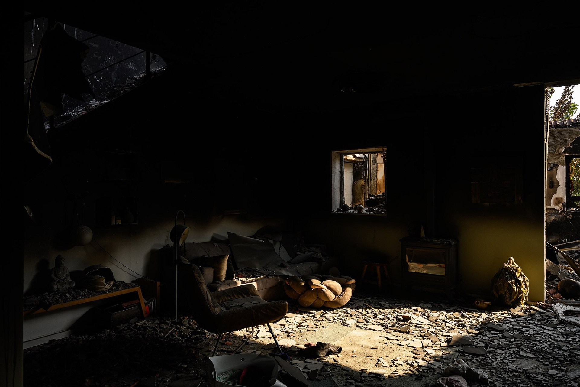 Within the compound, very few traces of the Israelis who were killed now remain, with the items of everyday life providing echoes as to the families who had lived here. Children’s toys. Family photos stuck to a fridge door. Laundry drying on a rack. Coloured bunting for a celebration.
