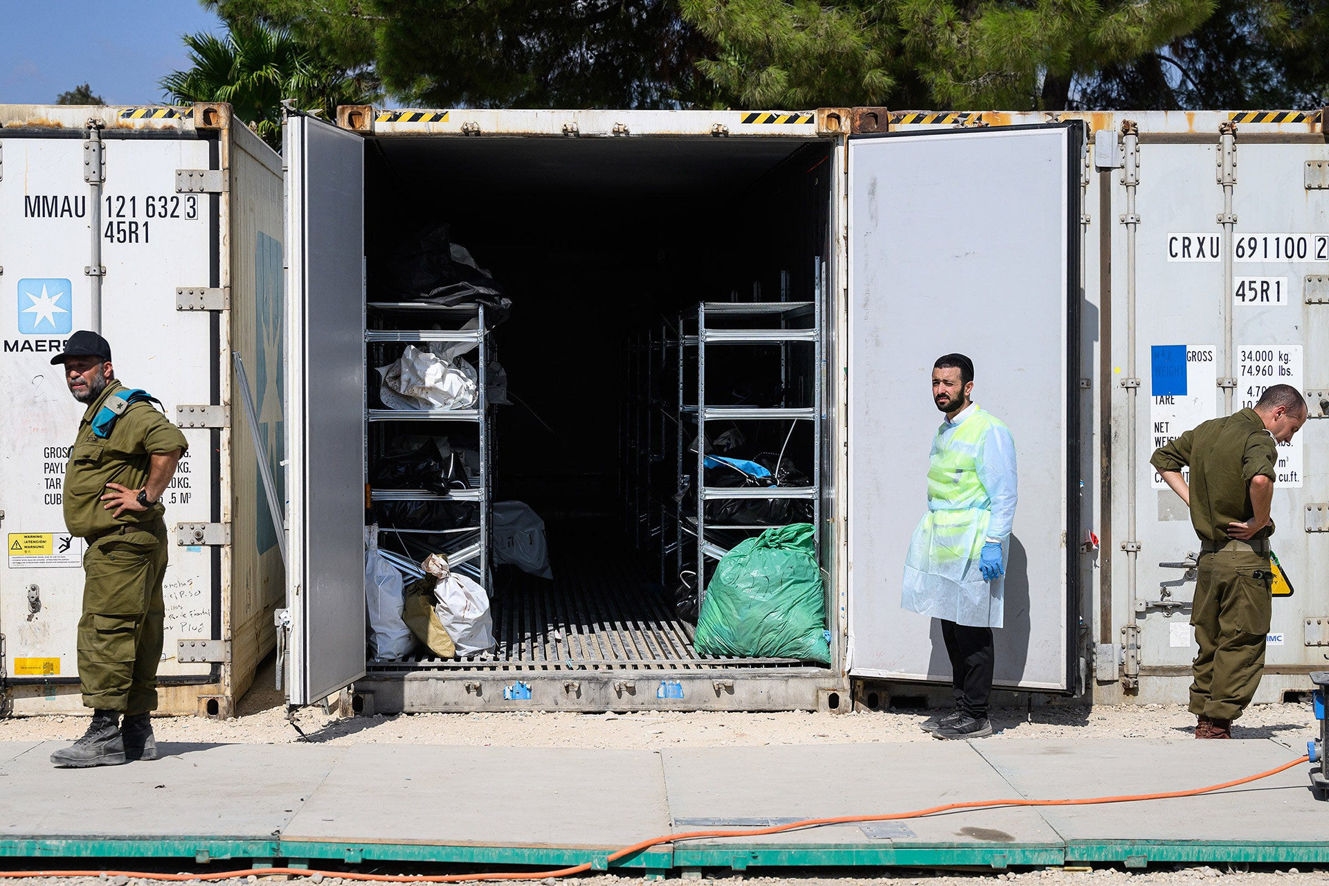 Travelling across town to a military base, members of the media were taken to where the bodies of the Israeli dead were being identified and stored. An enormous shift in protocol and media access in Israeli culture, medical staff swung the doors of the refrigerated shipping containers open to reveal the racks of bodies, cocooned in bags. As we documented this truly awful sight, a lorry stood nearby with thirty more bodies, waiting to be identified and returned to their families. The tradition of burial on the same day as death has been disregarded due to the forensic work needed in putting a name to the remains.