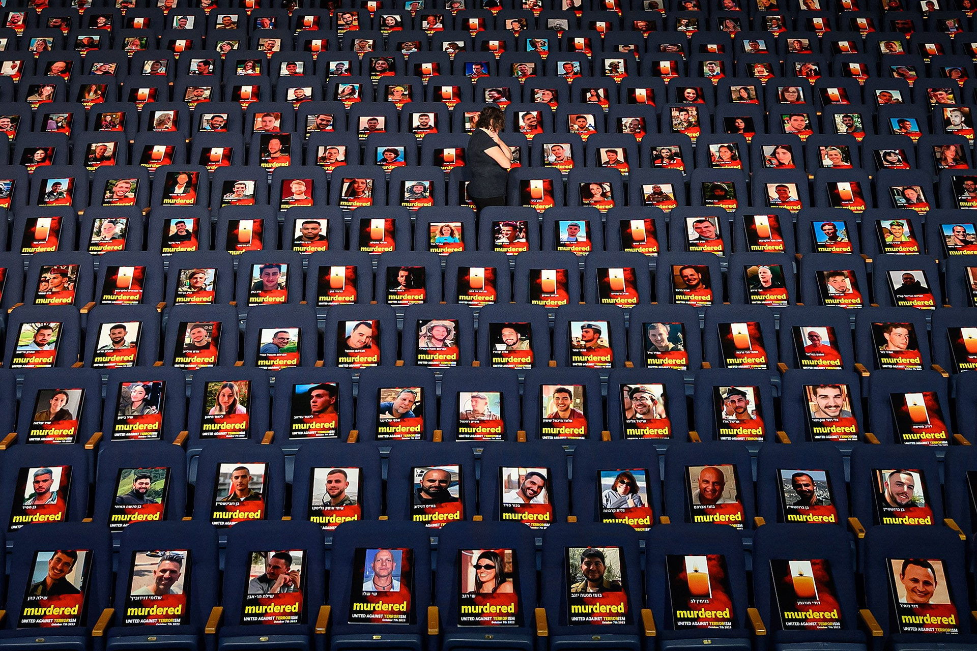 In the auditorium at Tel Aviv University, photographs were placed in seats, showing the names and faces of over 1000 of those who were killed, taken hostage or remain missing. Like the Shabbat Dinner table installation, it was another sobering image to see so many photographs of smiling faces, captured in happier times.