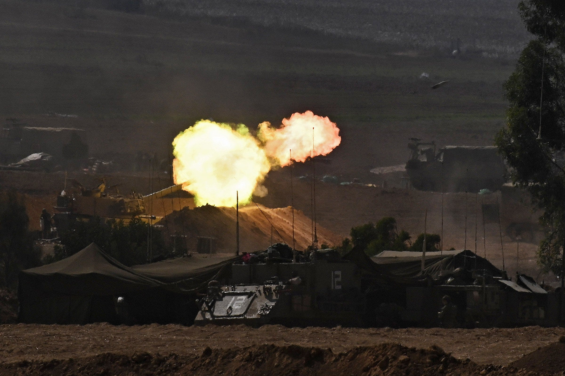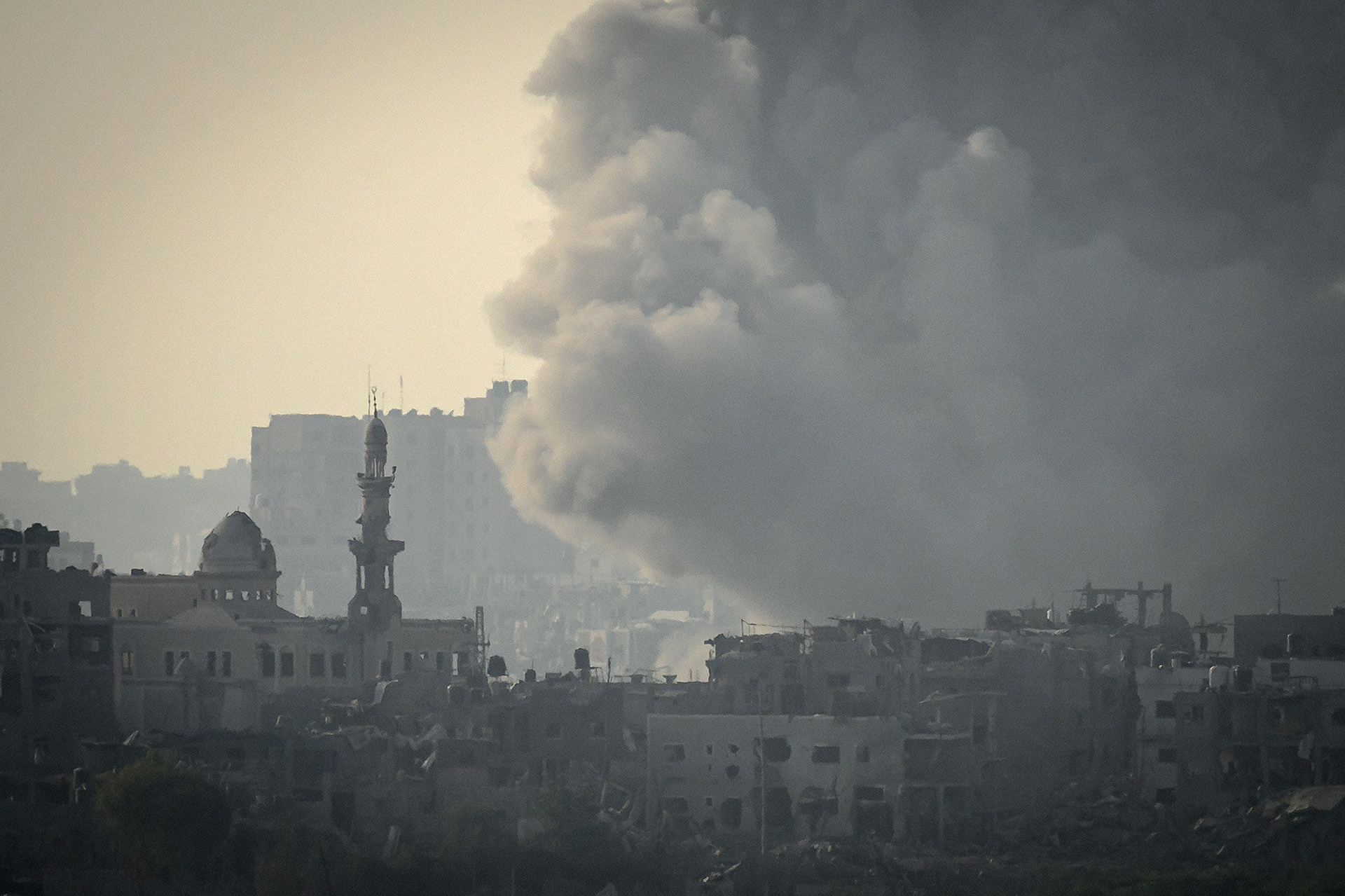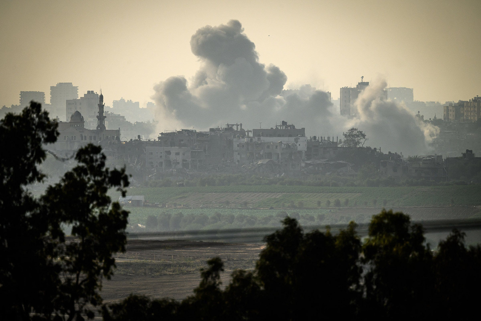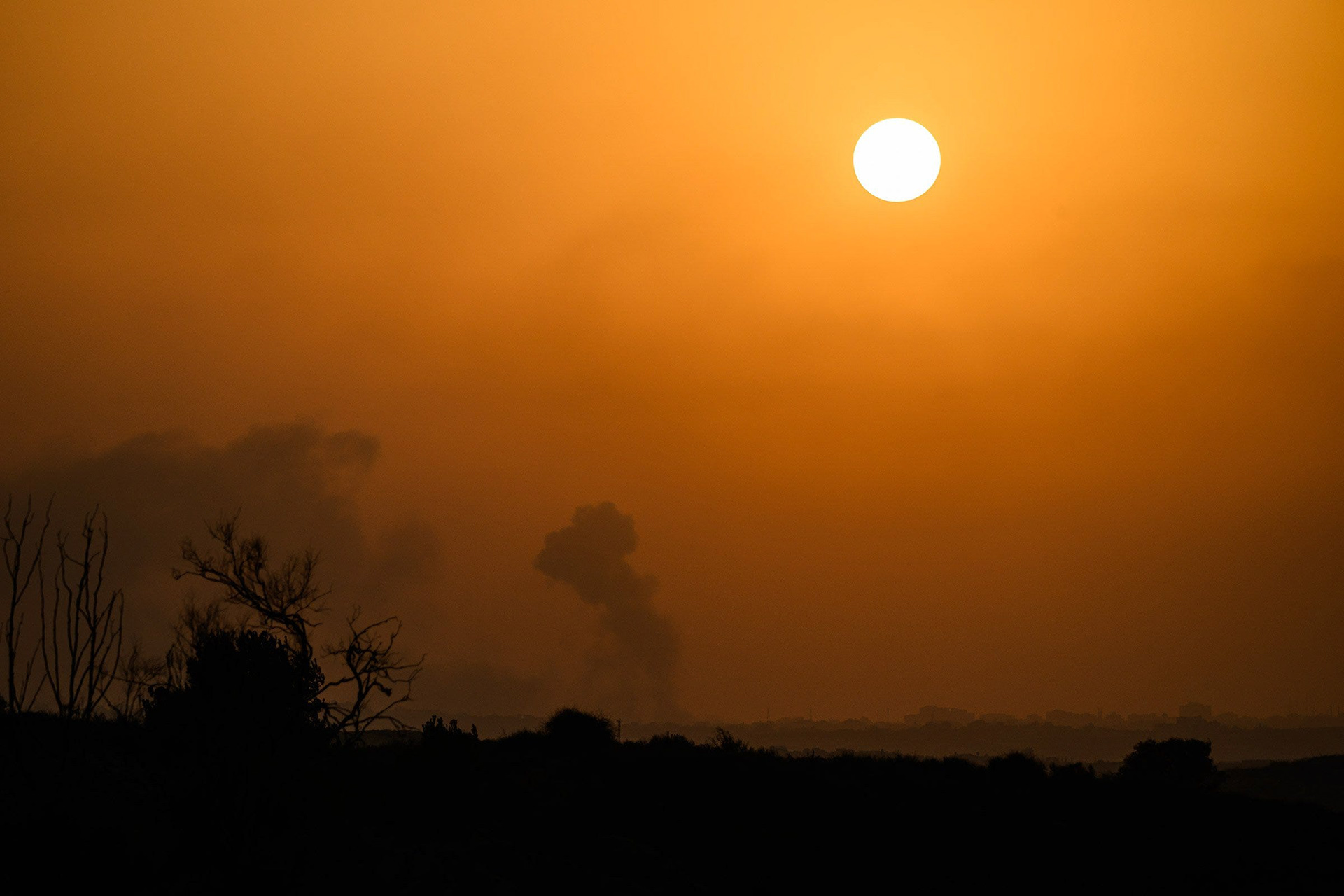 Back at the Gaza border, the low hum of a distant drone circling above is regularly interrupted by the rush of a fighter, circling once, twice, before a plume of smoke appears in the distance. Seconds later, the boom of impact reaches the assembled media overlooking the scene. Time and again, the strikes hit all across the horizon, some falling into the no-man’s land in between our vantage point and the Gaza fence.