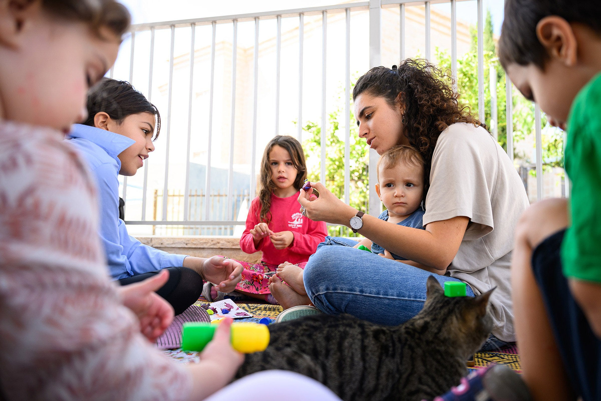 Travelling across to Beit Shemesh, residents of some of the southern towns and cities have found themselves sharing small rooms in hostels, as ultra orthodox communities provide temporary housing. Idan and Rivka showed me their single room, that they now share with their six children. Outside, Omer was volunteering to assist with childcare, as well as offering counselling to the women who had been forced to flee their homes. Asked how she was managing, she explained that she’s currently at university studying to become a social worker, with recent events testing her new-found knowledge. A little girl nervously told Omer that she knew some English. After some encouragement, she taught me how to count to ten. Somehow, I managed to keep getting it wrong. Her laughter was priceless.