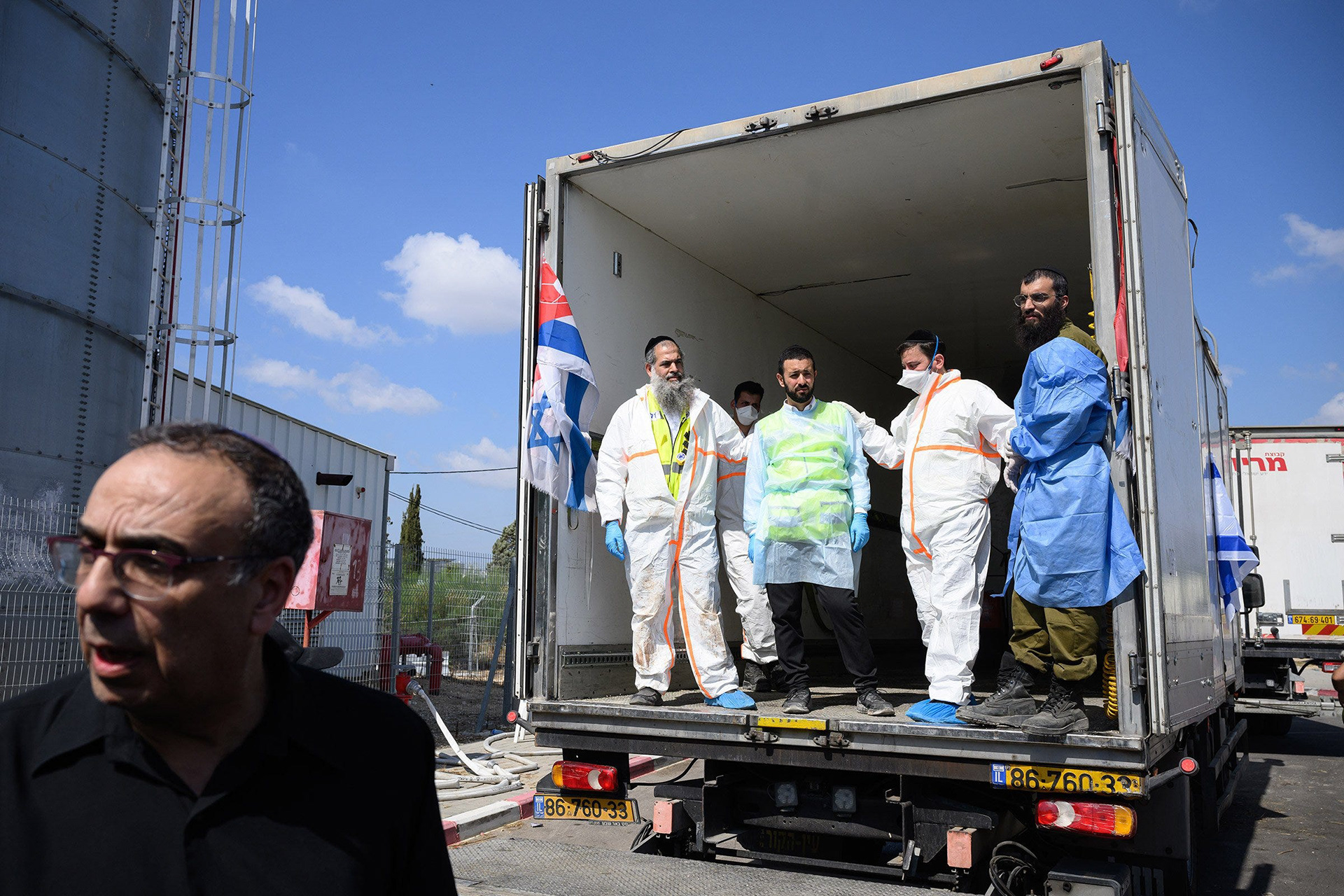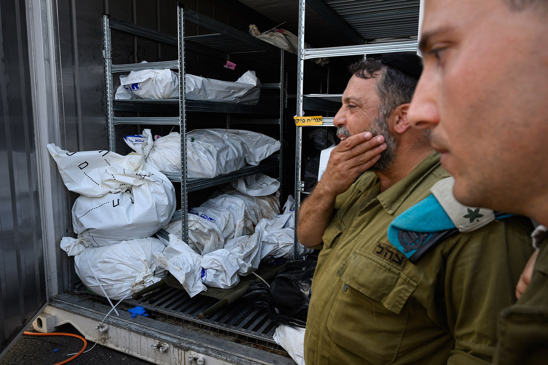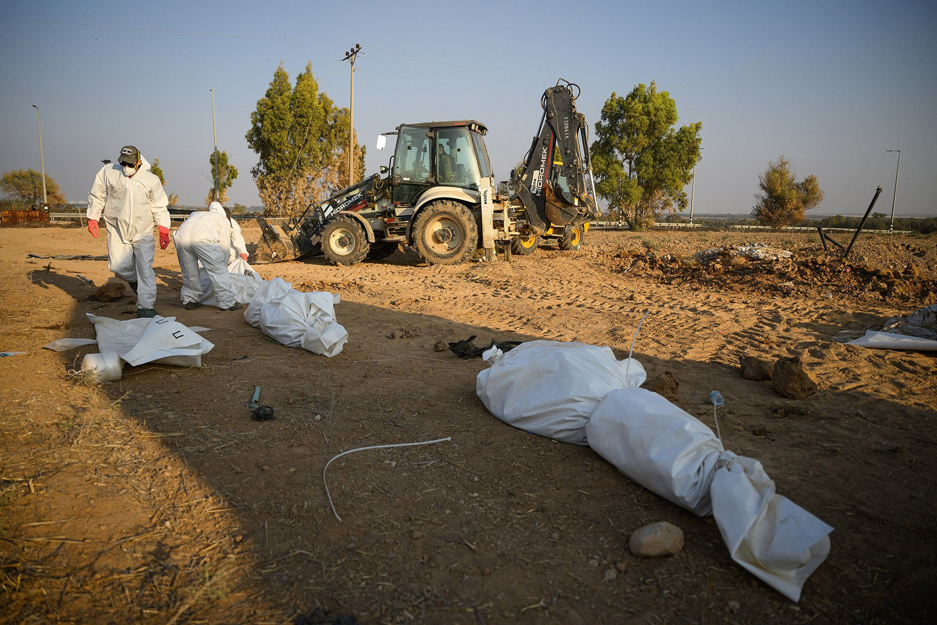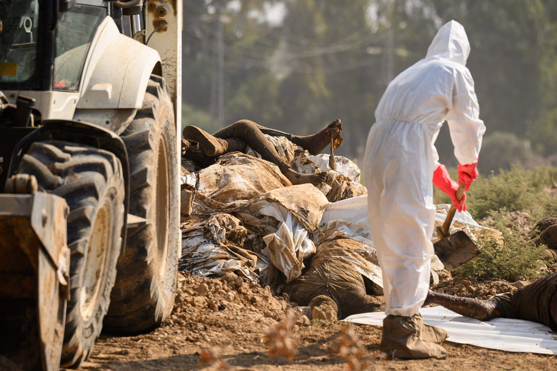 Escorted to the site, only a few kilometres from the border with Gaza, the invited media were greeted by the scene of a team of workers in masks, removing the bloated and decaying bodies of Hamas fighters from a pile using construction machinery, as they placed the remains into bags.