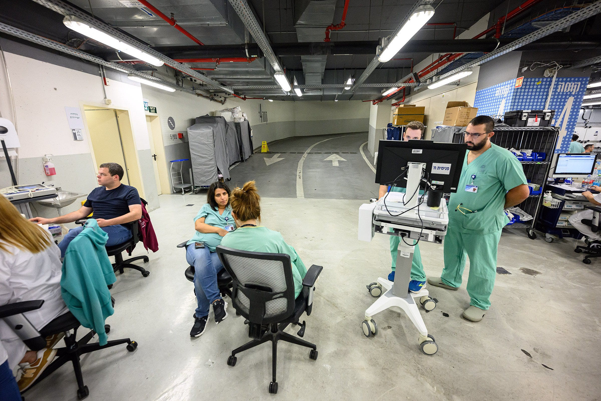 Across town, and four floors down to the subterranean hospital ward deep beneath the Sammy Ofer Heart building at Ichilov Hospital. In a sad indication of the regular war-stance that the country adopts, the parking garage below the hospital was purpose-built to be converted in times of need, with room for just under half of the regular hospital patients. All around the beds of the patients are the traffic-flow symbols and bay markings that hint at the spaces regular use.