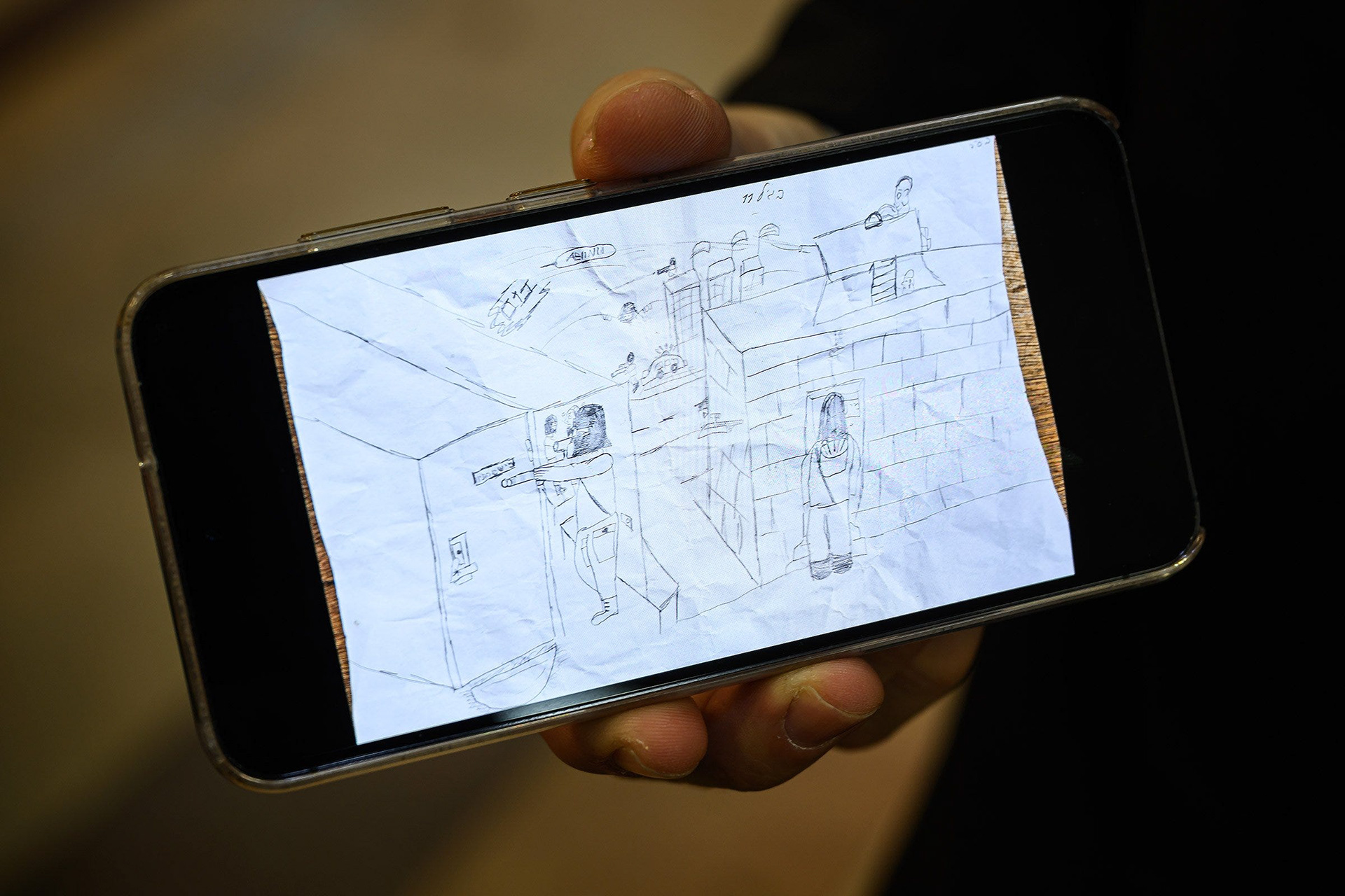 Afterwards, one of the organisers showed me a photo on his phone of a sketch by a young boy of the things that he’d witnessed. In the drawing, masked men shoot at his door, while others shoot at the house next door. His father climbs through a hatch in the ceiling to find a member of Hamas waiting. Overhead, rockets boom and explosions are seen.