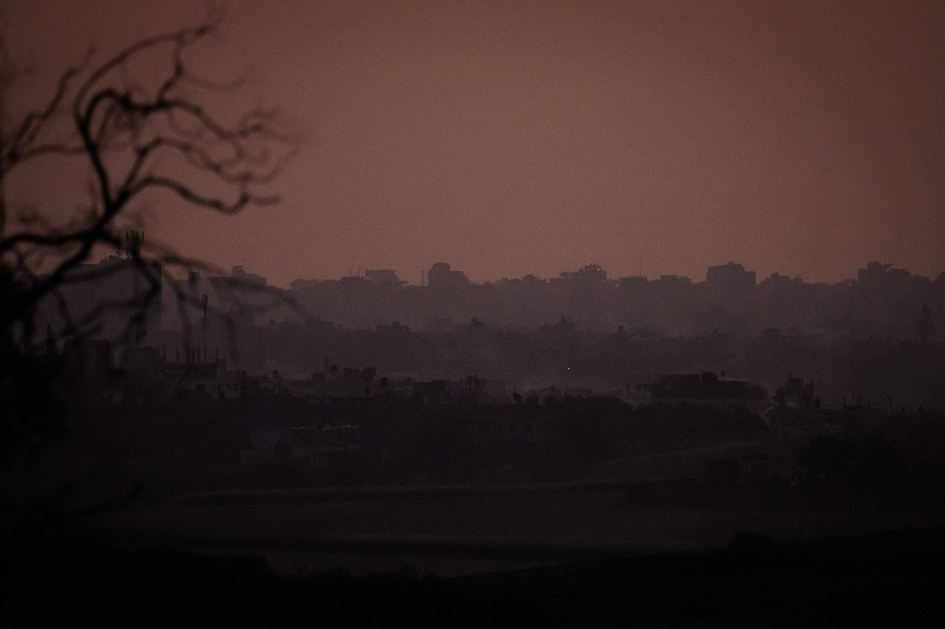 The sun sets over the horizon and the strikes continue. As the day fades and it becomes harder to focus, it dawns on me that across the whole horizon, I can only see a single solitary light in Gaza. The skeletal shapes of the ruins which were so sad to see in the day have somehow taken on an even darker form.