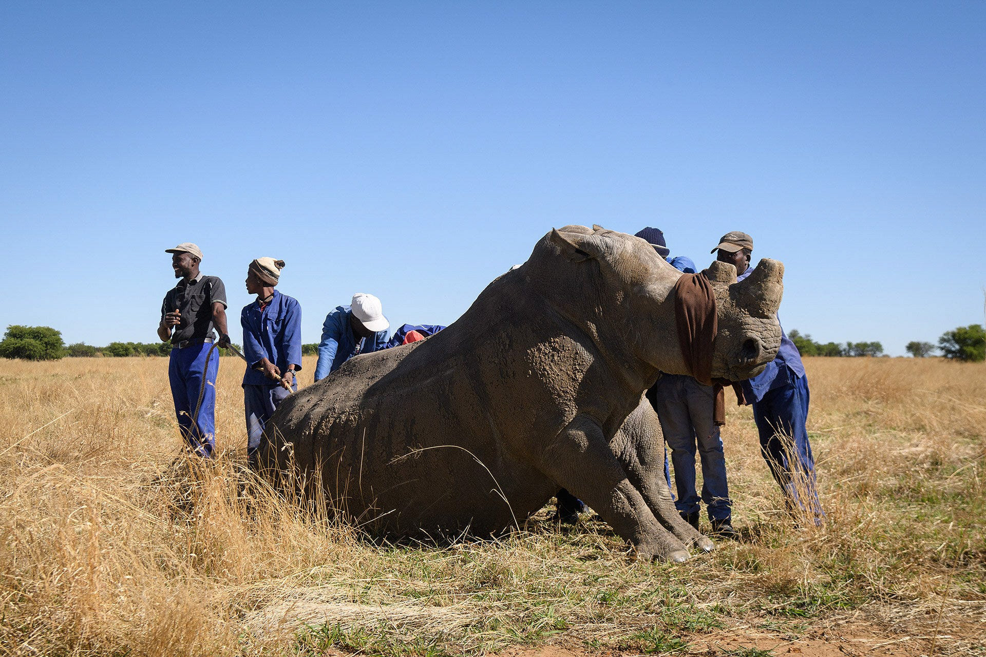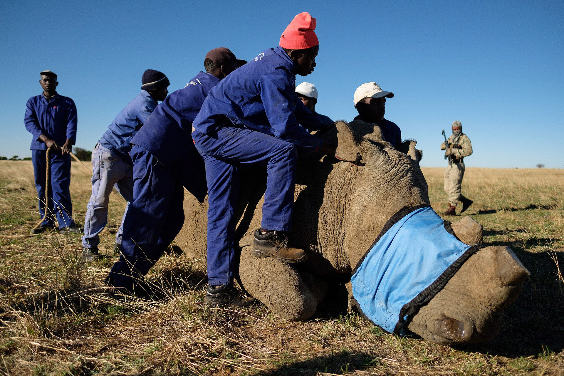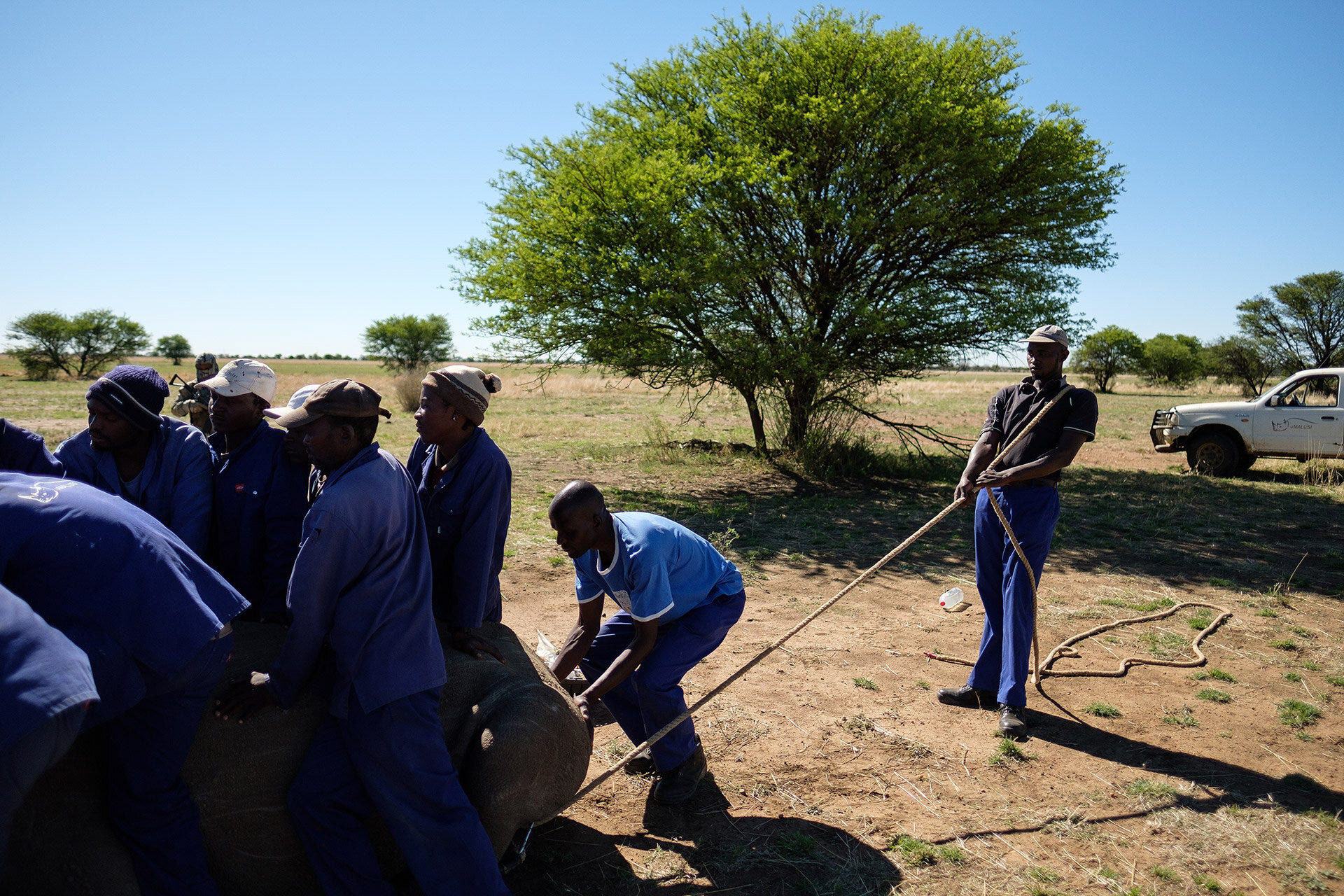 While some fought the effects, running for a while, they soon slowed and succumbed to the drug, falling to the floor and rolling over. Some battled the effects, resulting in strange moments where the sedated and blindfolded rhinos stumbled across the fields, pursued at a slow walking pace by the handling teams.