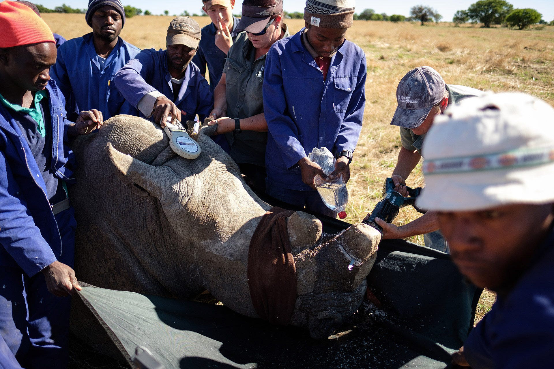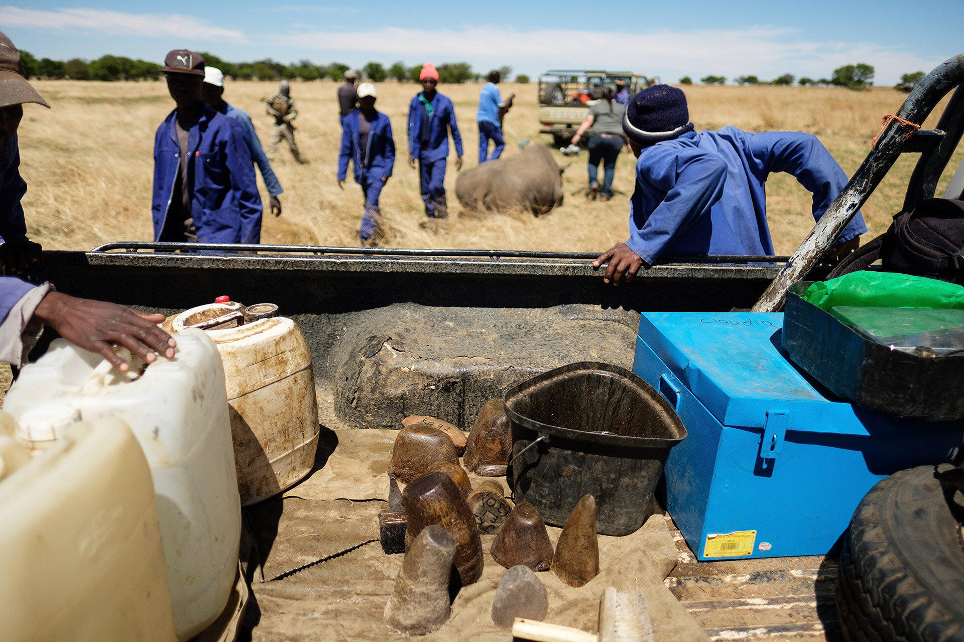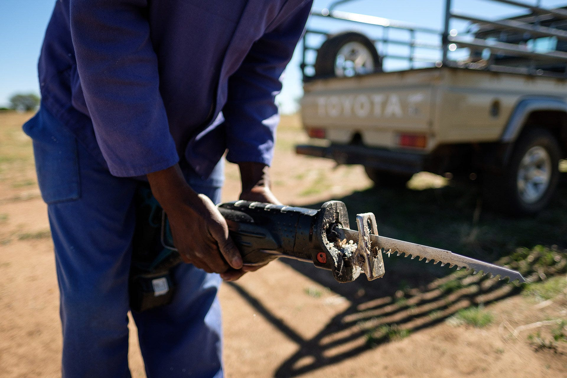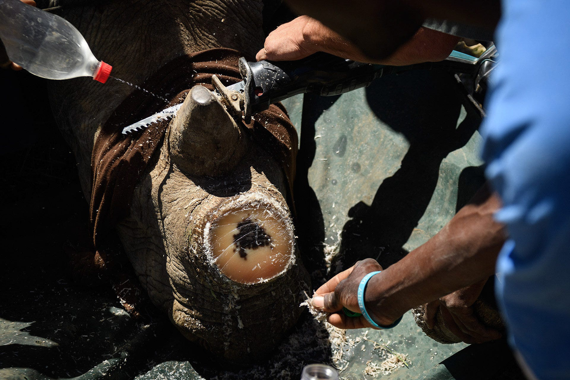 Once down, the teams quickly blindfold the rhino and lift it upright to allow the horn to be accessed. A new blade is fitted and work begins straight away. While one man cuts through the horn with an electric saw, another sprays water onto the area to prevent heat building up through friction. The whole process is over in a couple of minutes.