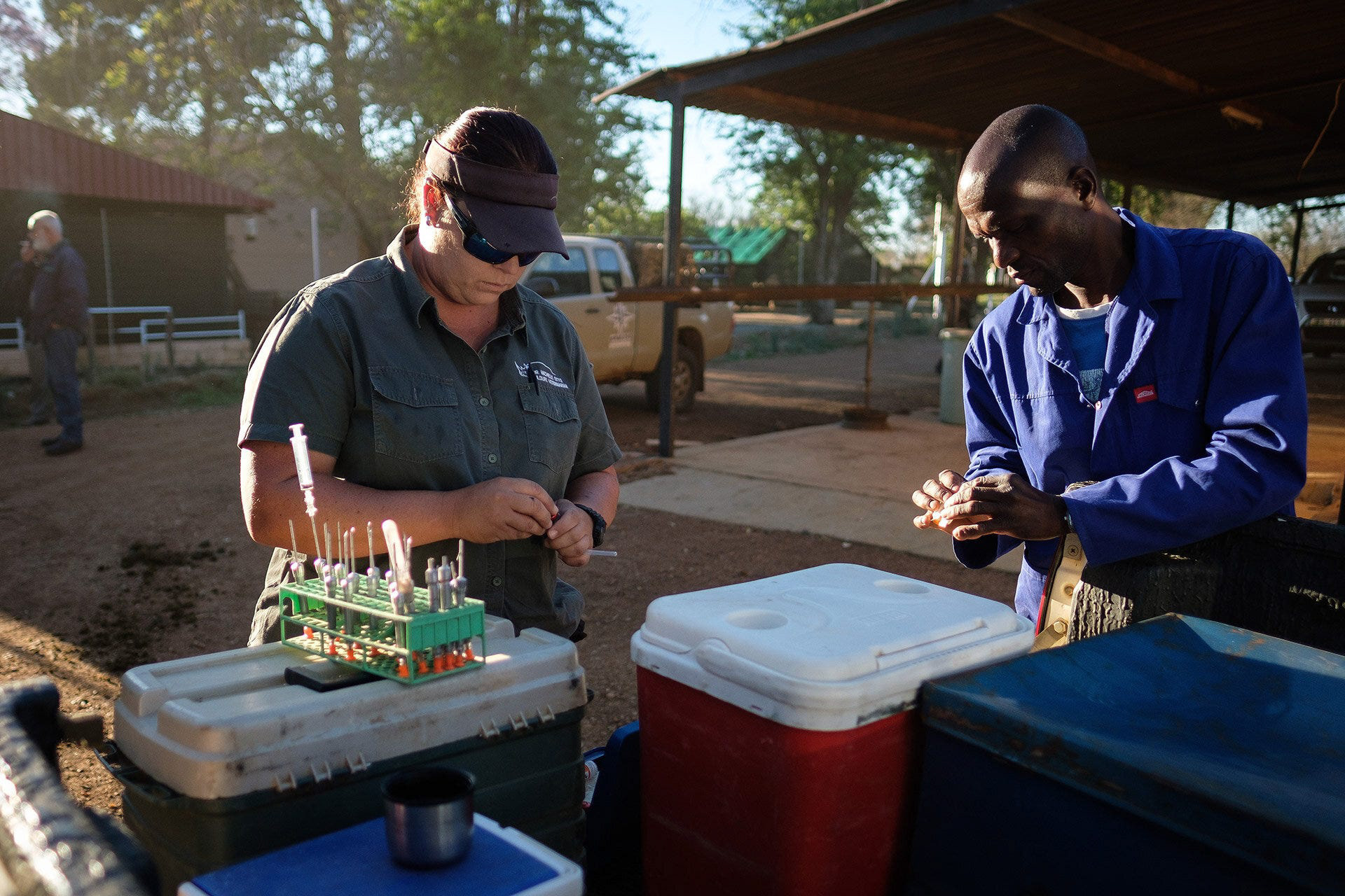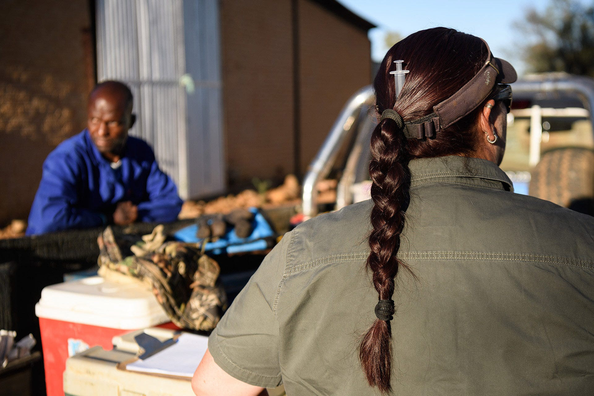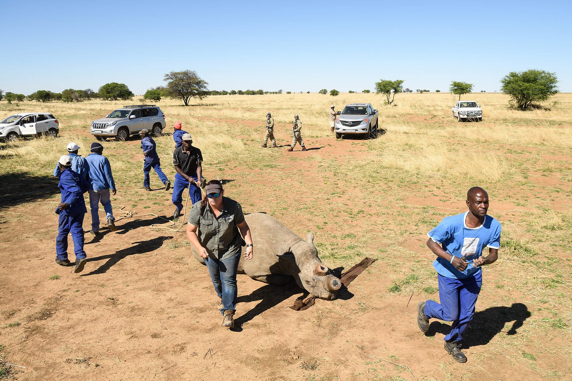Seeing the trimming process, it’s clearly a very well-rehearsed procedure that ran like clockwork during my time on the site. A mounted ranger rides ahead on his horse to locate the next rhino, followed closely by veterinarian Michelle Otto in a pickup truck with a team of staff, handing her darts, DNA packs and other items as needed. On finding the next candidate, Otto tranquillises the animal with a dart fired from a rifle.