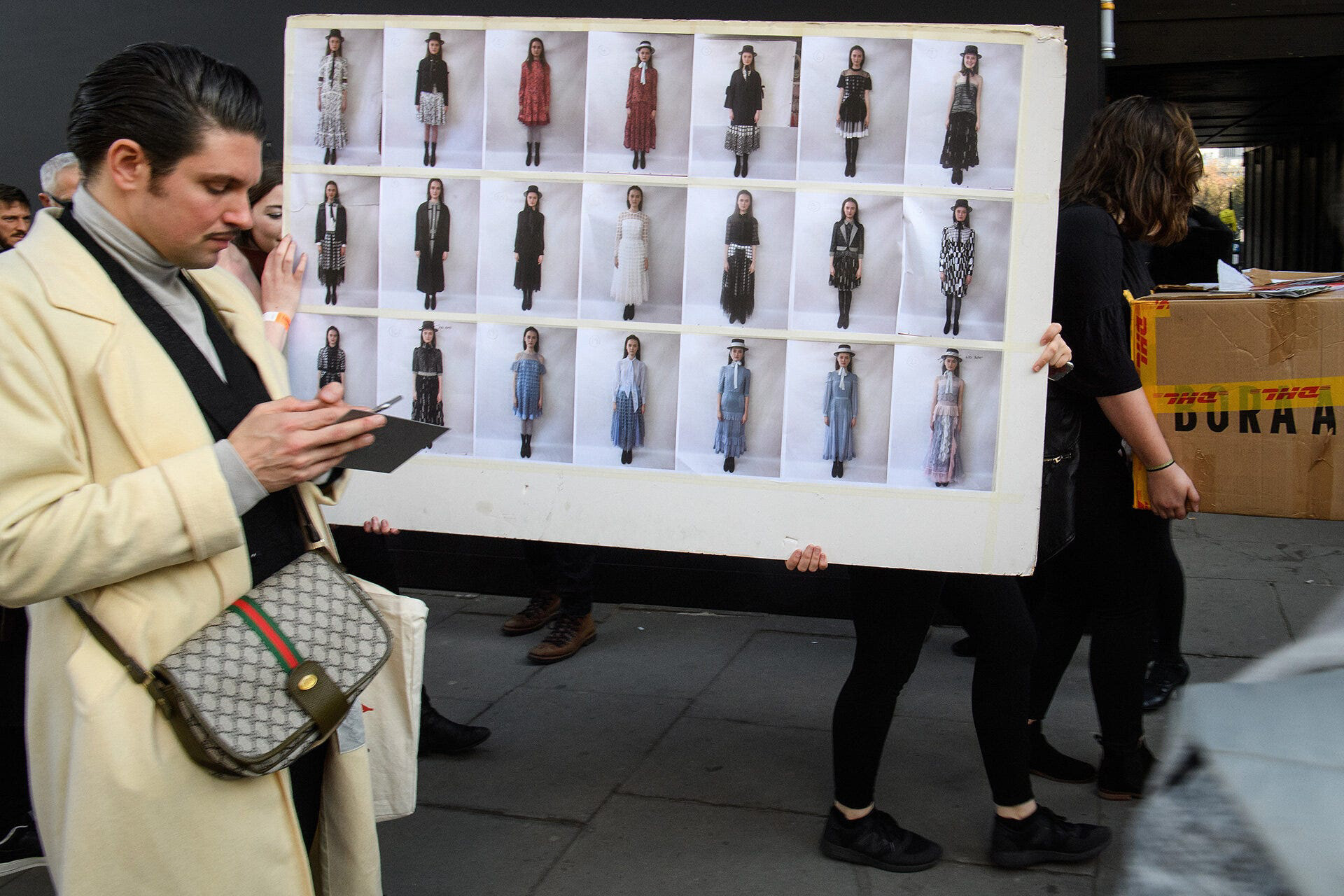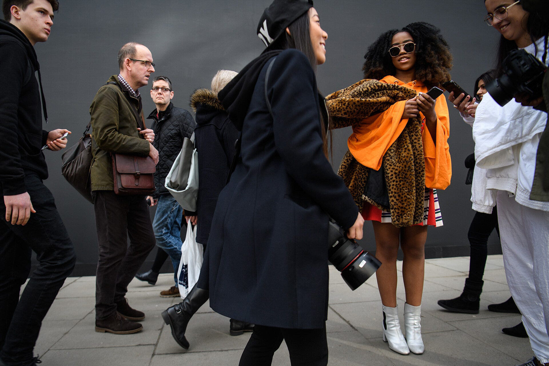 Dividing my time into themes, I started with a day on the streets outside a few of the venues, among the bloggers, guests and bemused members of the public. Beginning my coverage outside was a good way to remind myself of the clammer and chaos that follows the fashion season as it moves around the world. Any car, particularly with blacked-out windows, that pulls up outside a venue triggers a flurry of activity as photographers, bloggers and fashion-curious types swarm in to see who’s arriving. The important people walk straight in without stopping. The semi-important will stop for a quick picture. The slightly more desperate take forty minutes to walk the ten metres into the venue as they pose up, take selfies and generally “live-stream” the whole car-to-door experience for their tens of followers.