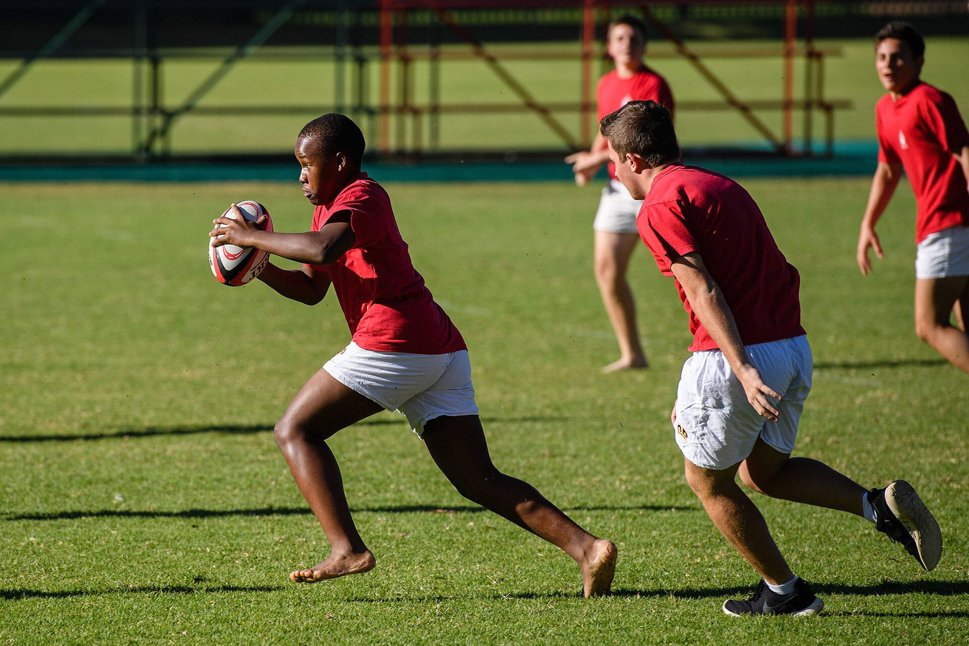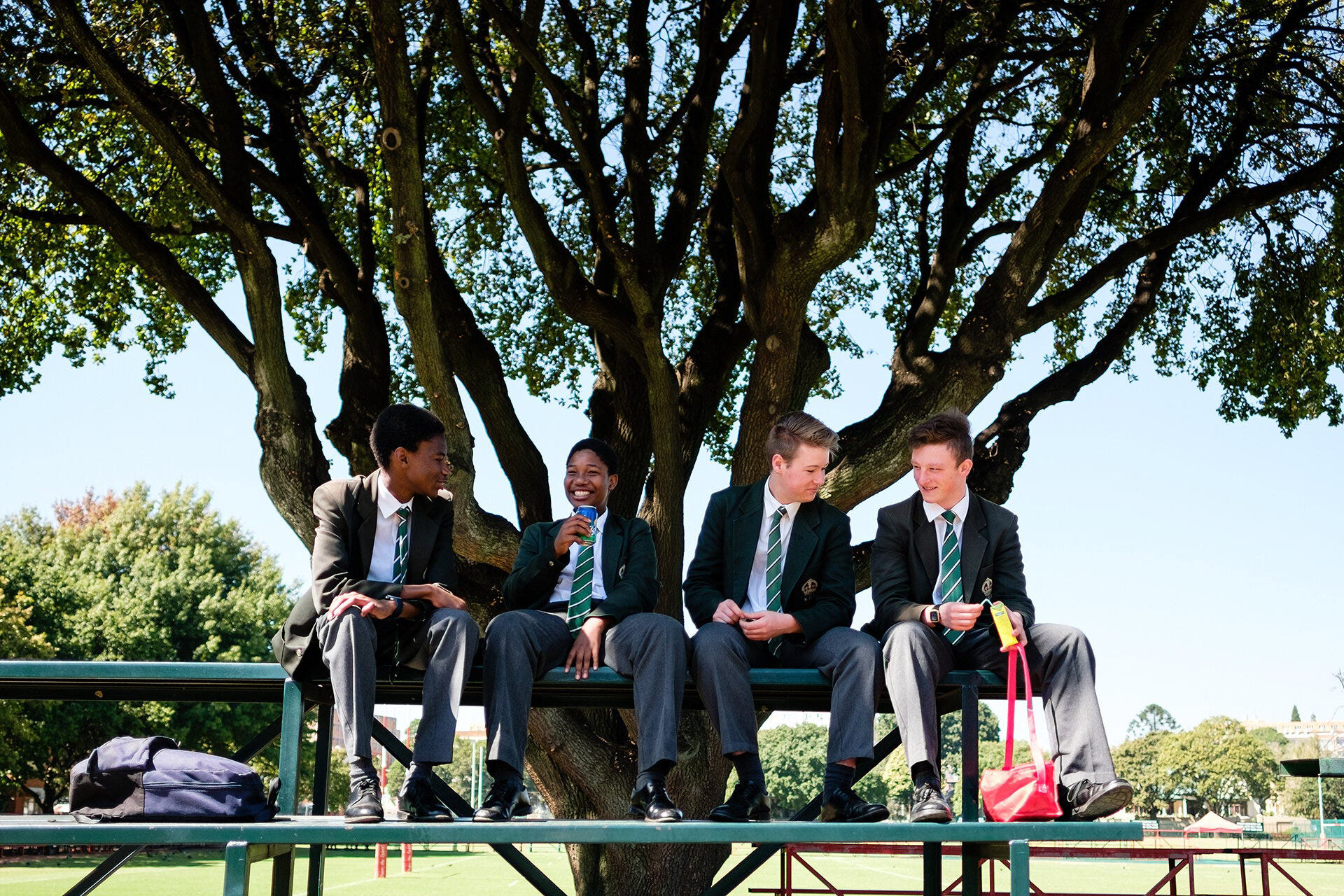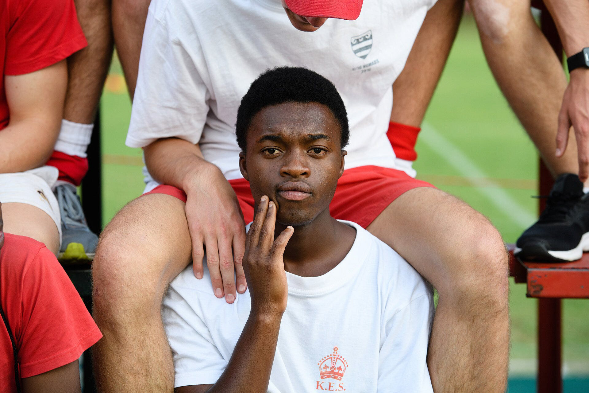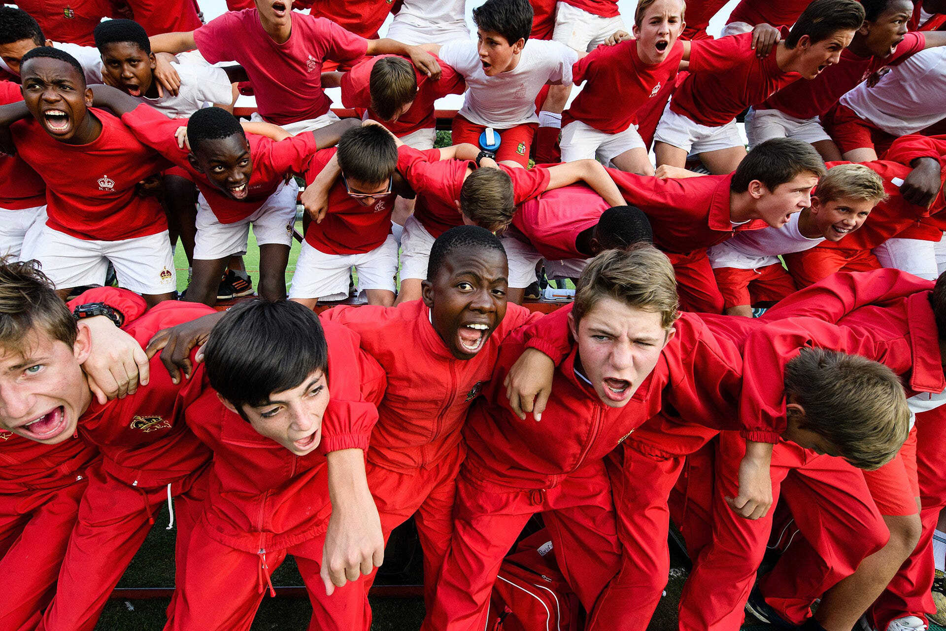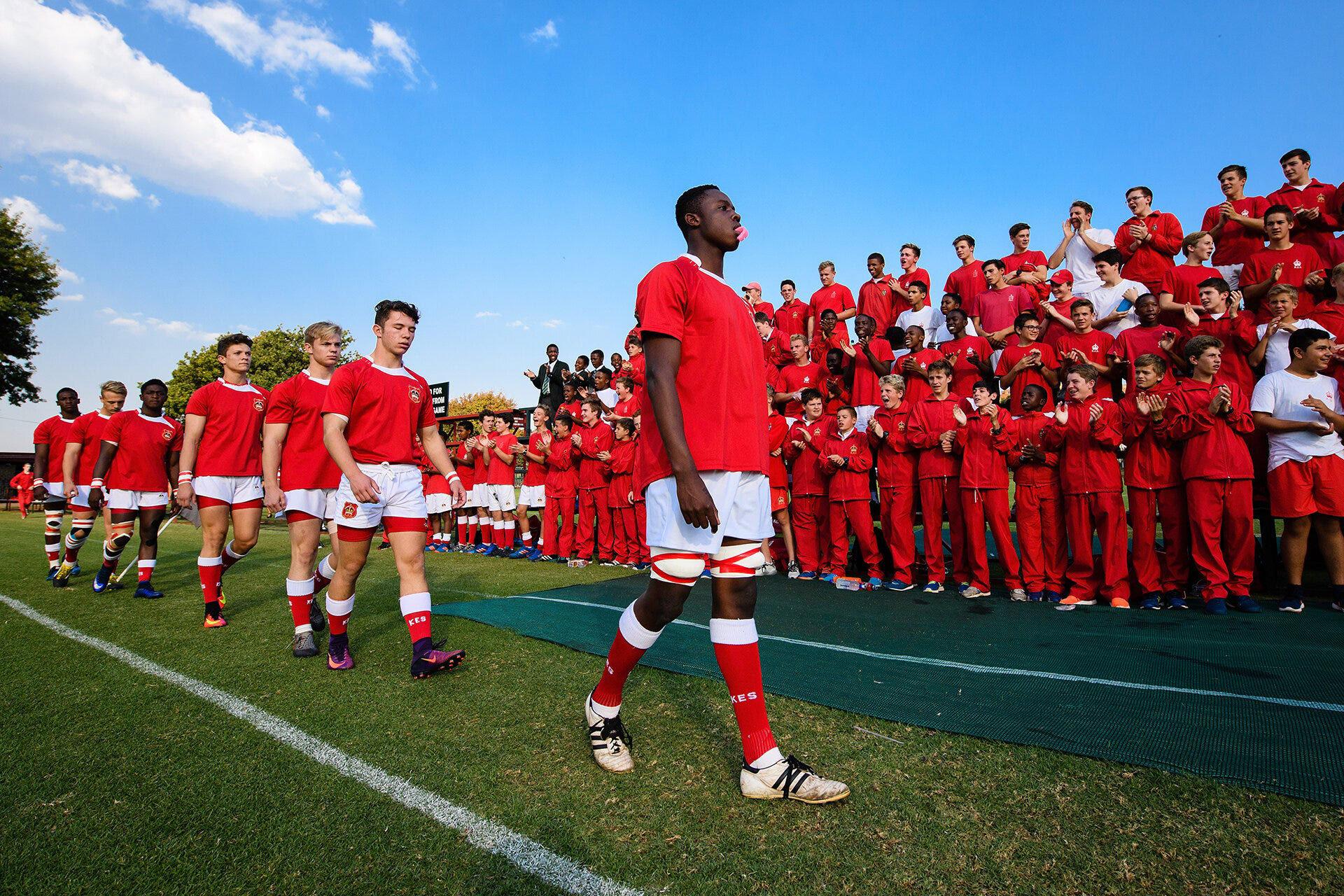 Shortly after the school day finished, students and parents gathered at one of the sports fields as the “Reds”, the school’s First rugby team, were preparing to play. I’d been told earlier that there may be good pictures to be had during the traditional “War Cry”, when students lock arms and welcome their team onto the pitch. However, it was just before this that I spotted a particular moment in the crowd. A student was sitting with his legs around a friend in front in such a way that really showed how little of an issue skin colour was to this new generation of South Africa. Another tick.