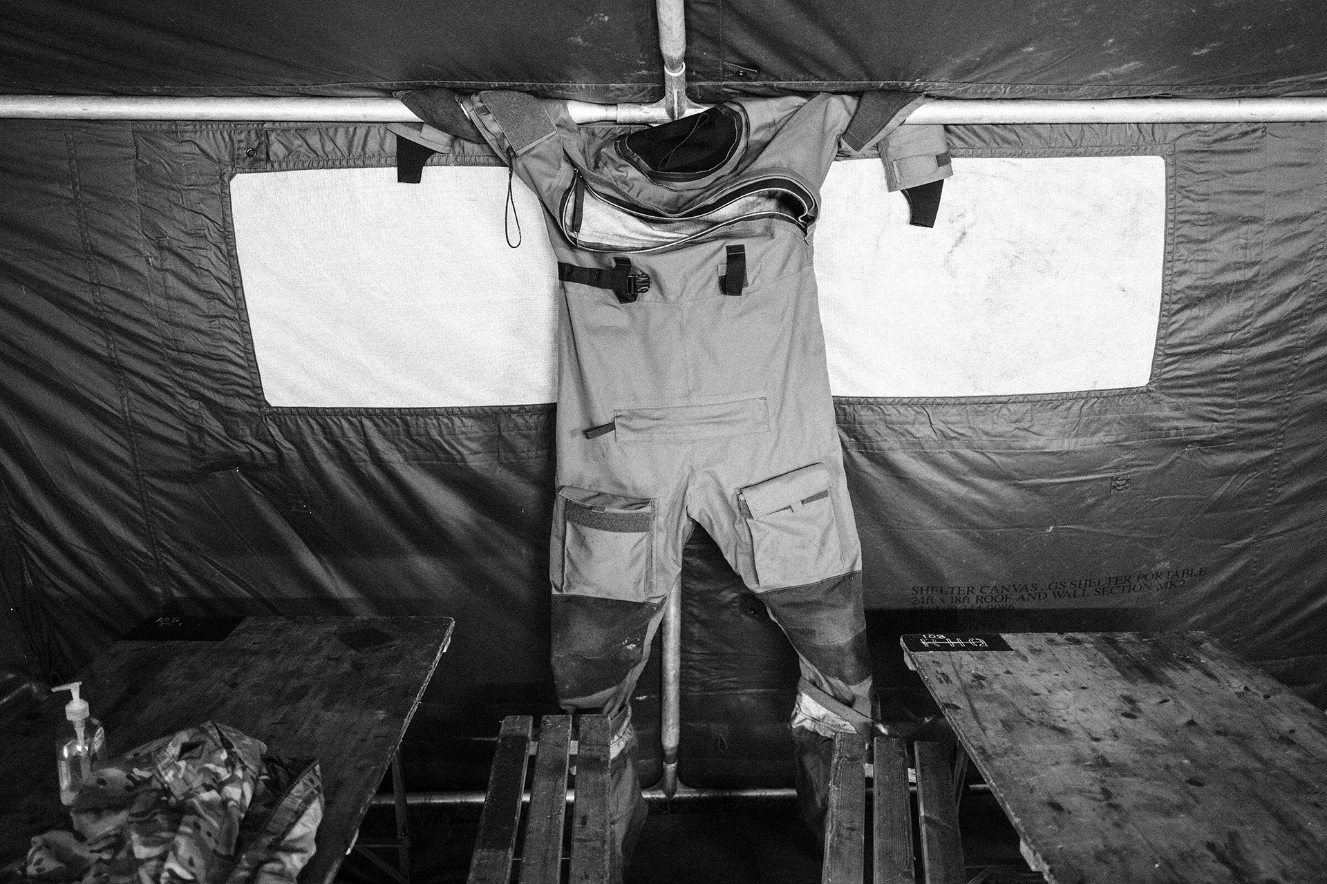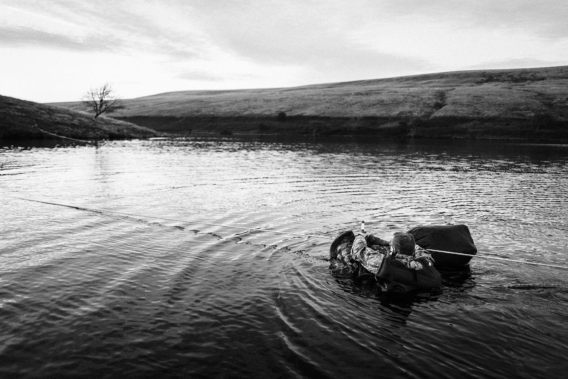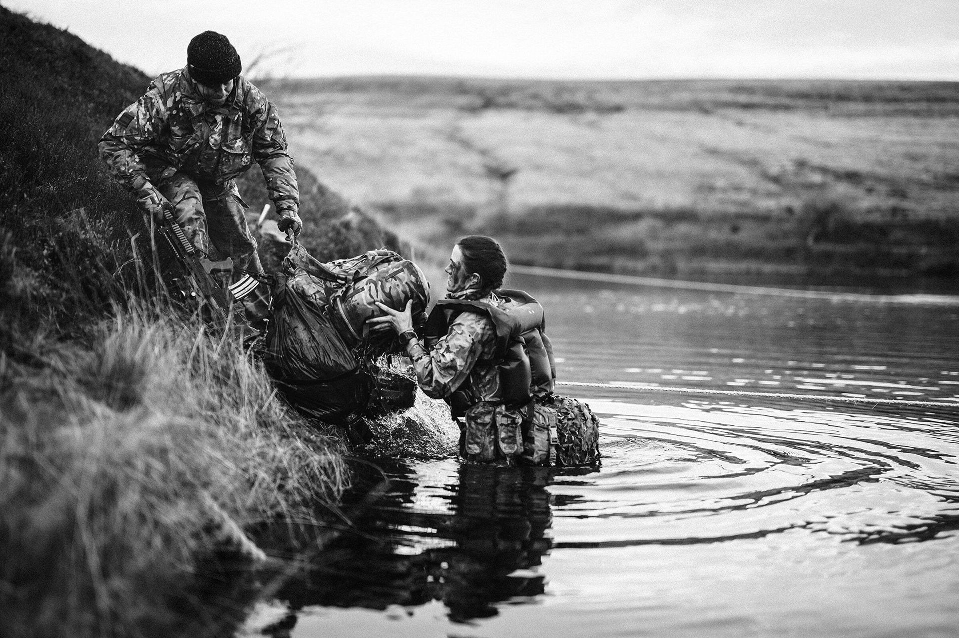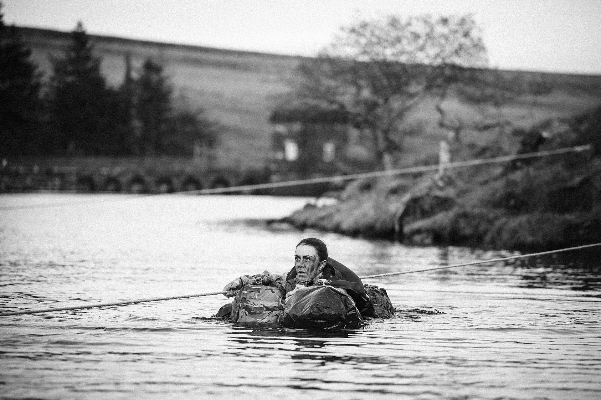 After hours of walking over rough terrain carrying full kit, the teams made their way up a long ascent to a man-made reservoir at the head of a valley, where an open-water crossing took place. The temperatures up there were low and when in a boat on the water, the wind cut straight through, so the idea of stripping away some of my clothing, bagging it up and taking the plunge was not an appealing one.