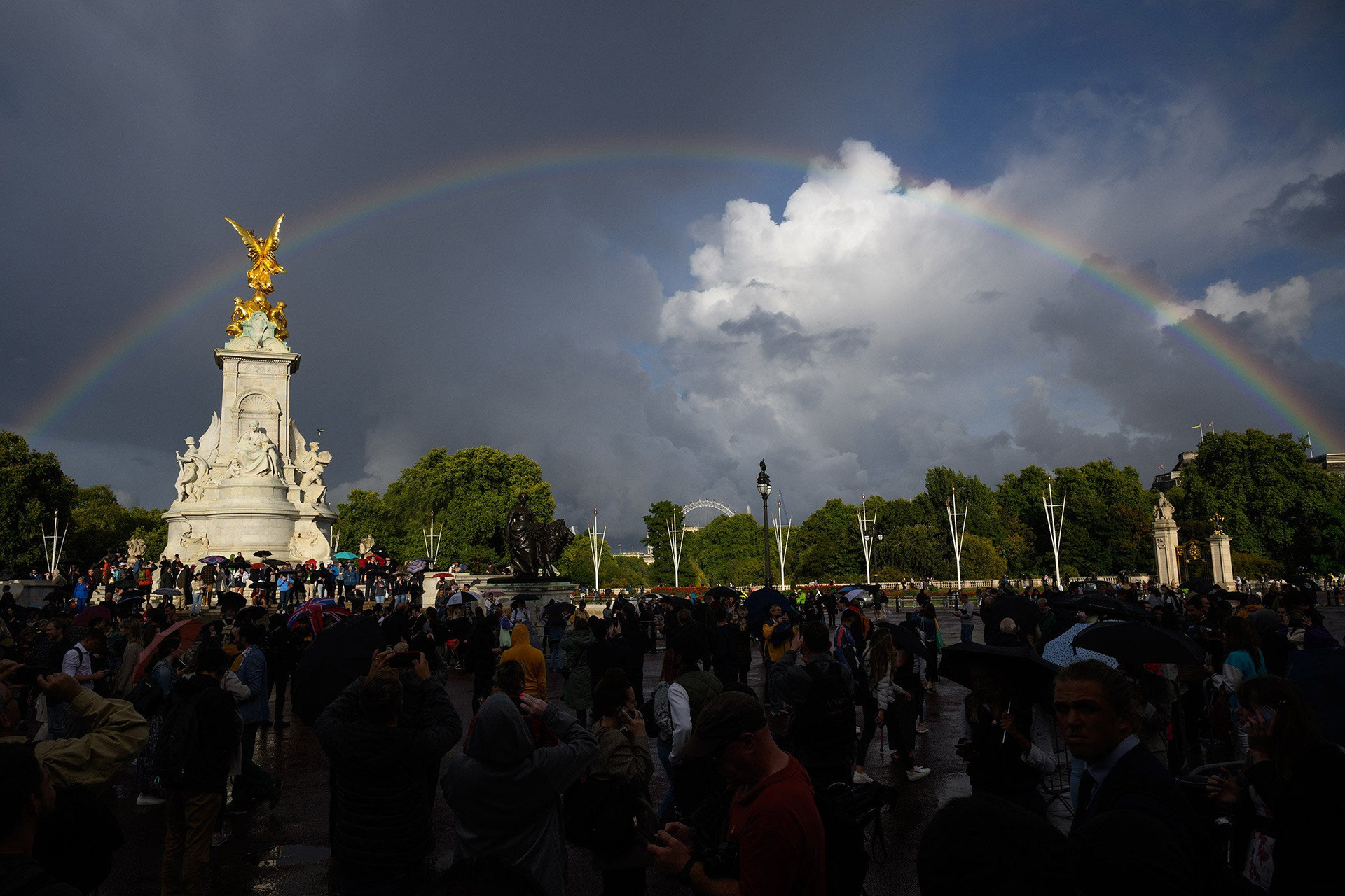 Only moments after the announcement was made, a striking rainbow appeared over the Queen Victoria memorial outside Buckingham Palace.