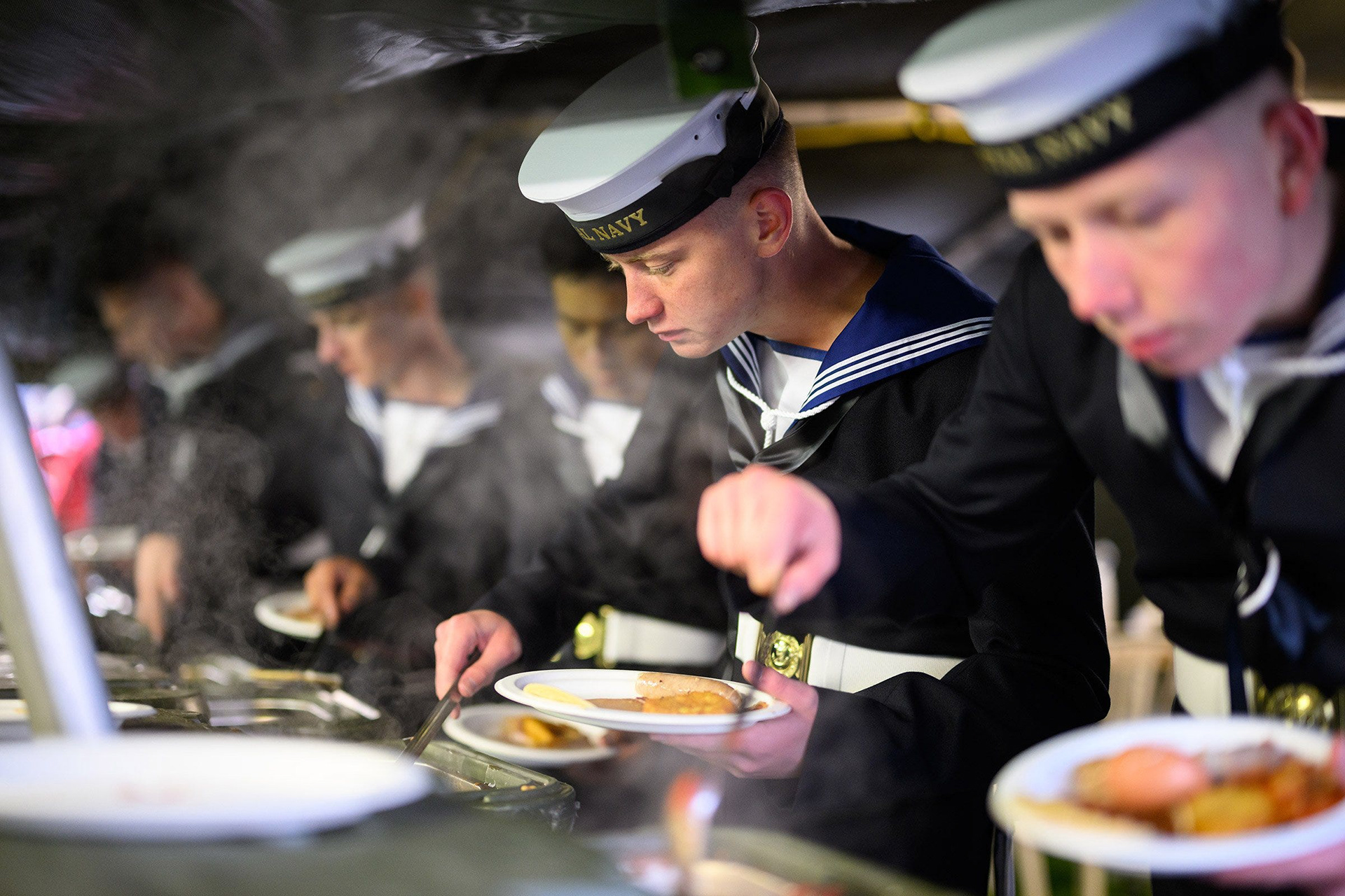 As the sky lightened, the members of the Royal Navy, British Army and Royal Air Force returned to Victoria Barracks. After standing in formation, the assembled personnel were dismissed to rest and eat breakfast, in a sudden burst of informality. Bearskins we’re now carried on rifles, icy fingers were compared and the rush to store ceremonial clothing before breakfast began. Seeing the different branches of the British military relaxing and eating together is a rarity and another small reminder of the magnitude of the event to come.