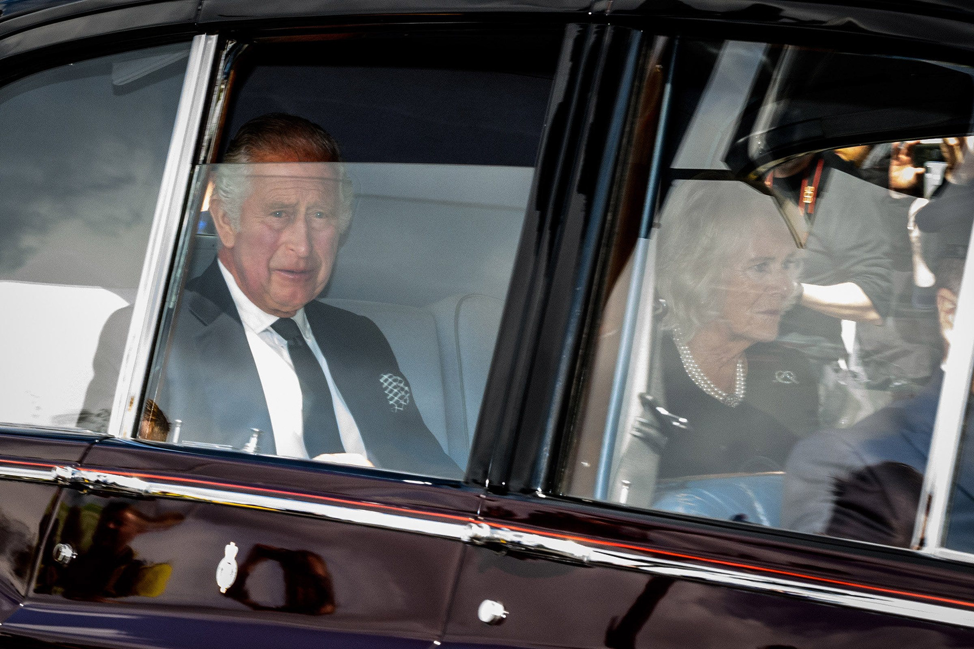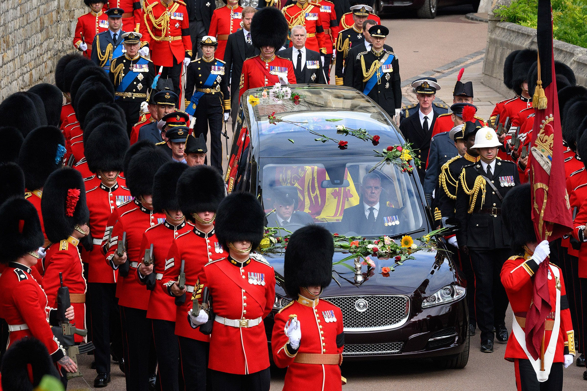 The funeral procession passed and the flower-strewn hearse carrying the Queen disappeared from view. Glancing back, I noticed the row of cars following behind. As the convoy turned the corner, the car carrying Prince George and Princess Charlotte was catching the reflections of the guards standing to attention along the route.