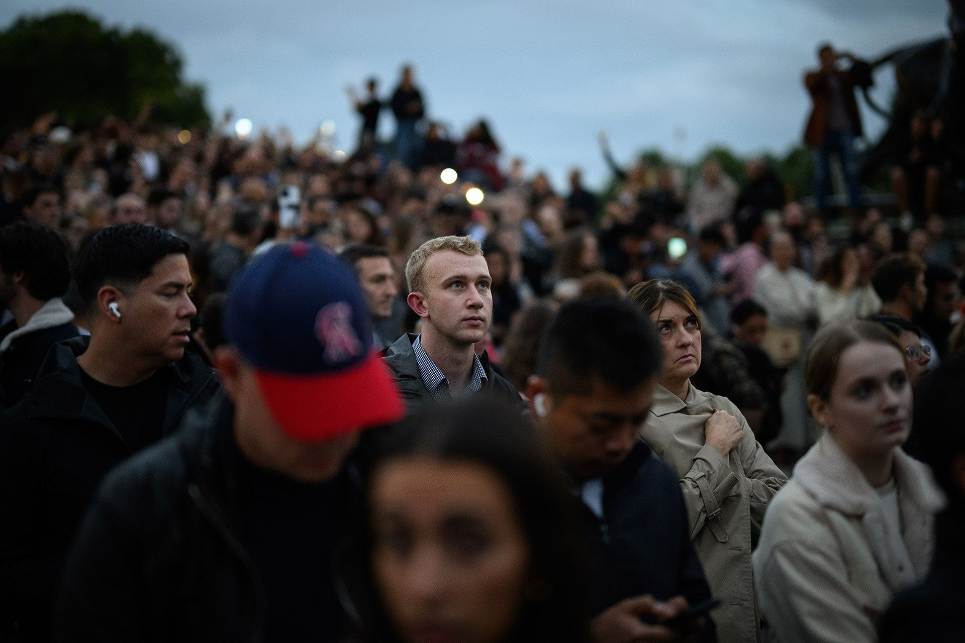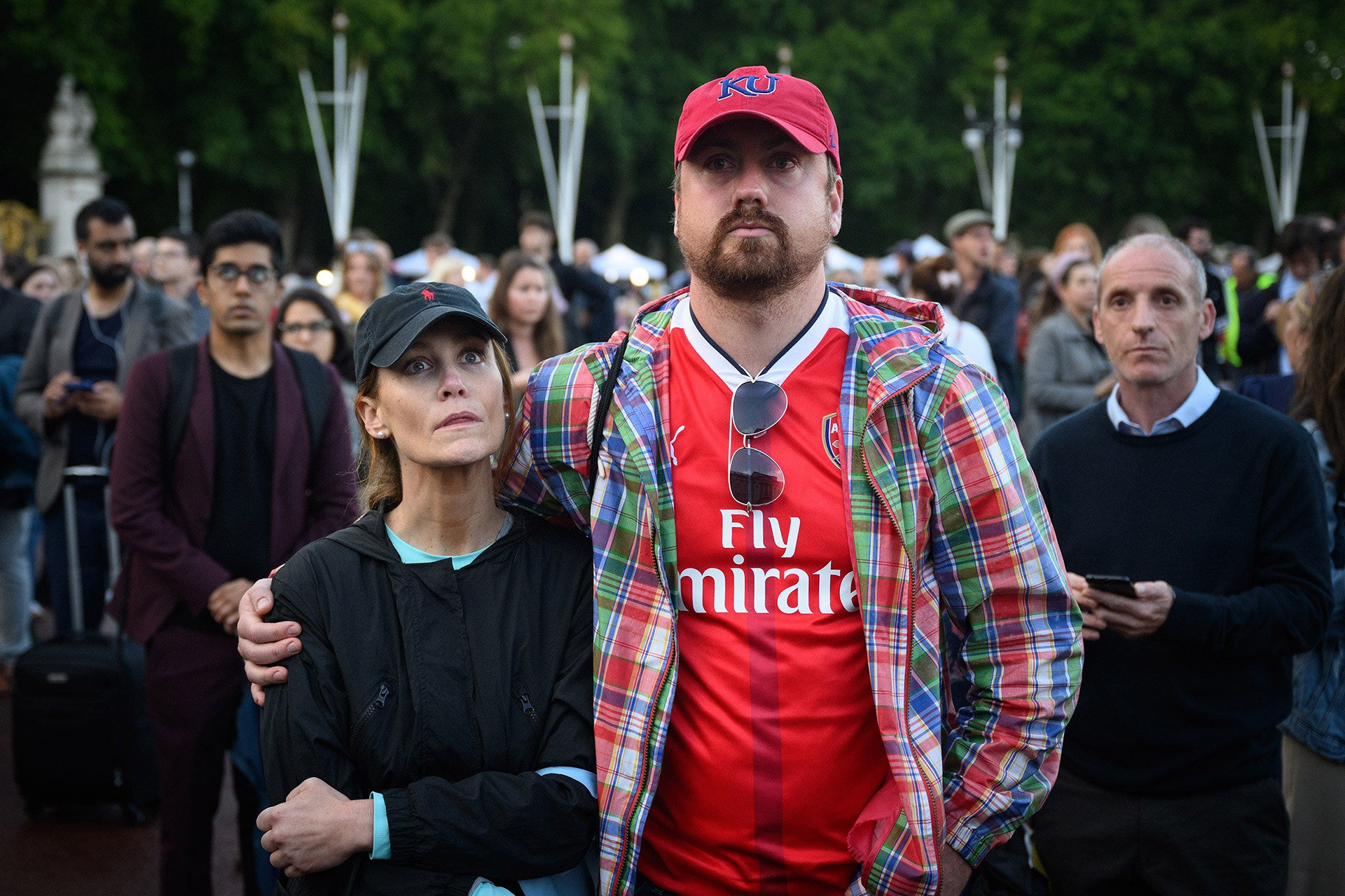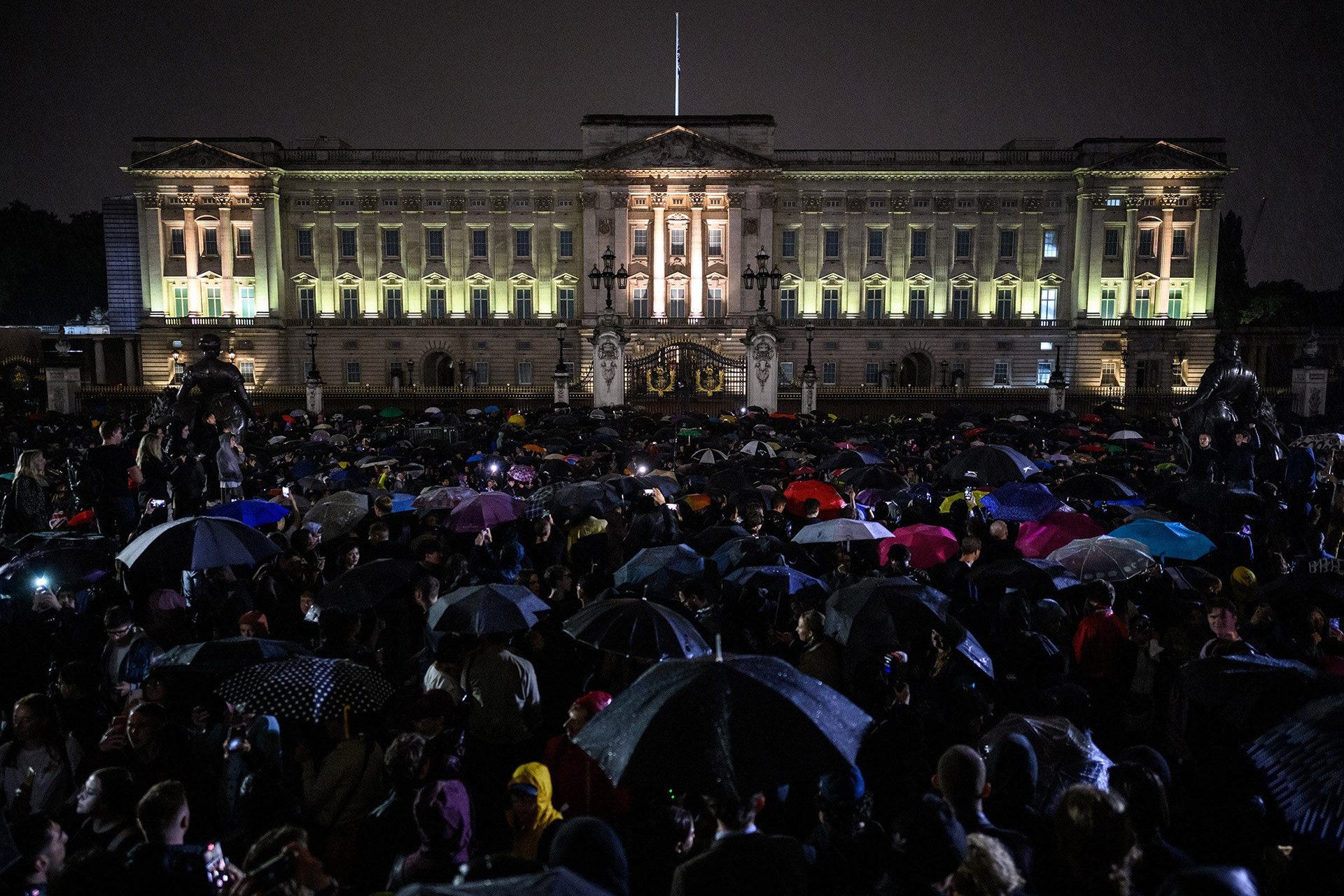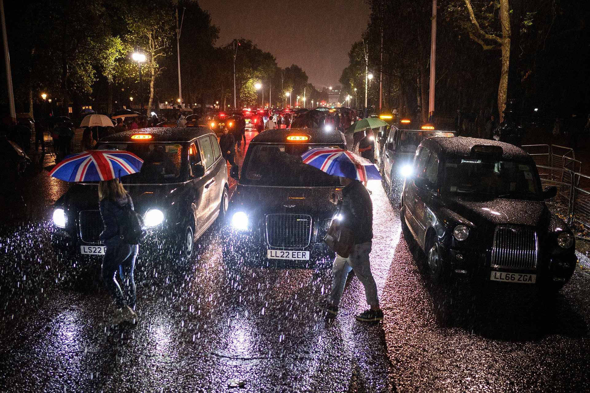 As the light faded, the torrential rain arrived. Those standing on the Queen Victoria Memorial sheltered under umbrellas, looking towards Buckingham Palace for the next part of the breaking news story to happen. Behind them, rows of London taxis lined up on the Mall to show their respects.