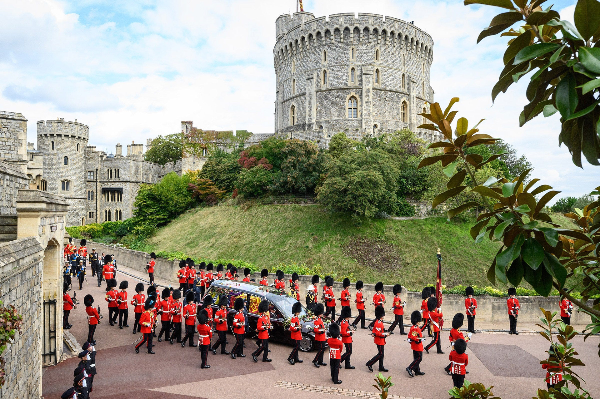 The public’s last chance to see the coffin carrying the Queen came the following Monday, as it was transported the short distance from Albert Road to the Castle Gates and out of view for the private stages of her funeral. Lining the stretch, members of the armed forces rehearsed positioning and stationary drill movements. As the empty hearse approached, heads lowered and checks were made to ensure chins were touching chests.