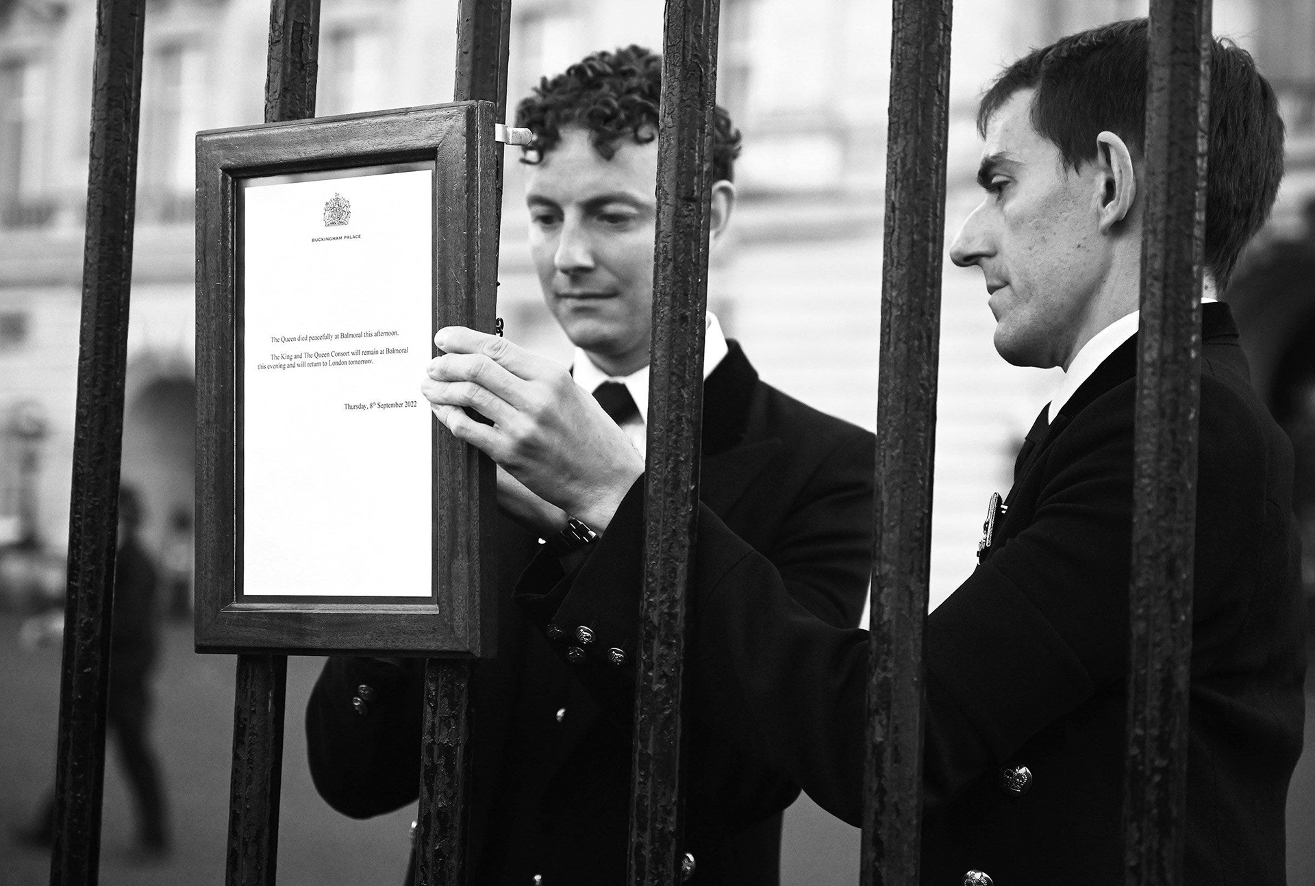 Within a short time, the official written pronouncement was carried to the railings and tied in place, for the public to see. Briefly sectioned off to allow members of the media to get images, the crowds were soon allowed through, surrounding the sign for hours to follow, phones held high in a bid to get their own photo. Chants of “Snap and move” broke out as those waiting to see became impatient with the people at the front taking too long.