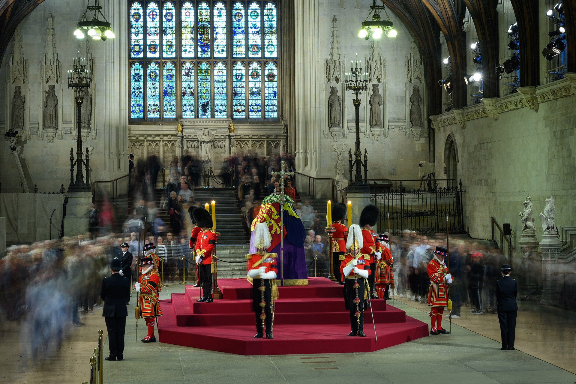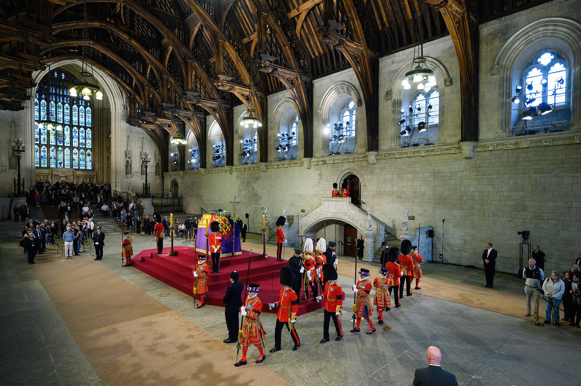 Inside the hall, the hushed sounds of shuffling steps was only broken every twenty minutes by the tapping of a stick on the stone floor to mark the changing of the guard. Watching the people in the queue, it was surprising to see so many walked past with barely a glance towards the catafalque. With wait times of well over ten hours at times, it all seemed to be over in a flash for some.