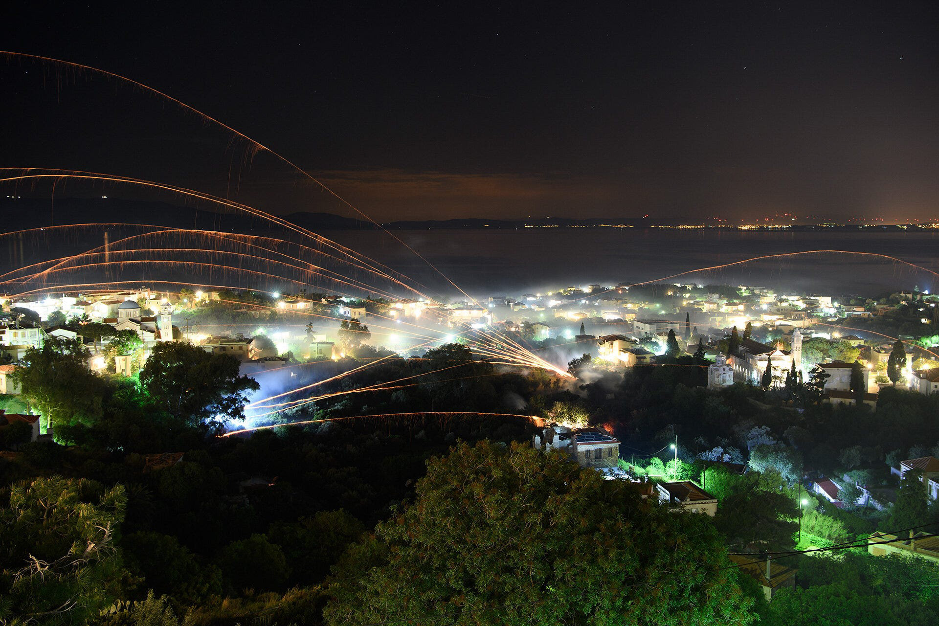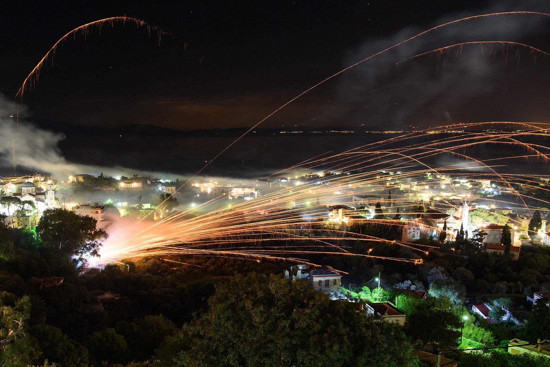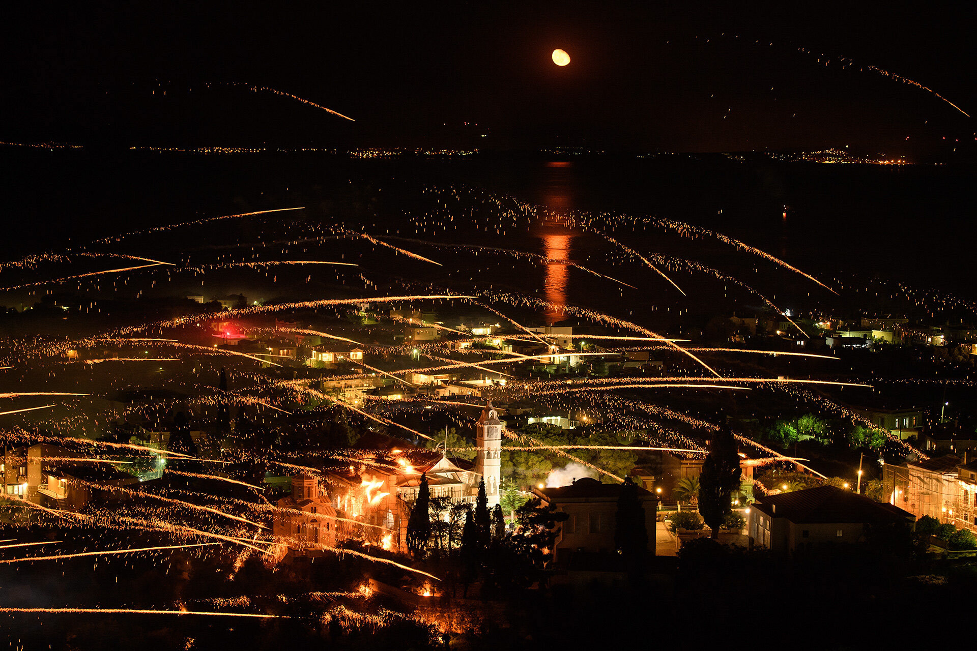By the time that the rockets start flying, there was a blanket of smoke across the village and, thankfully, the weather was perfect with a beautiful moon reflected in the waters towards Turkey.