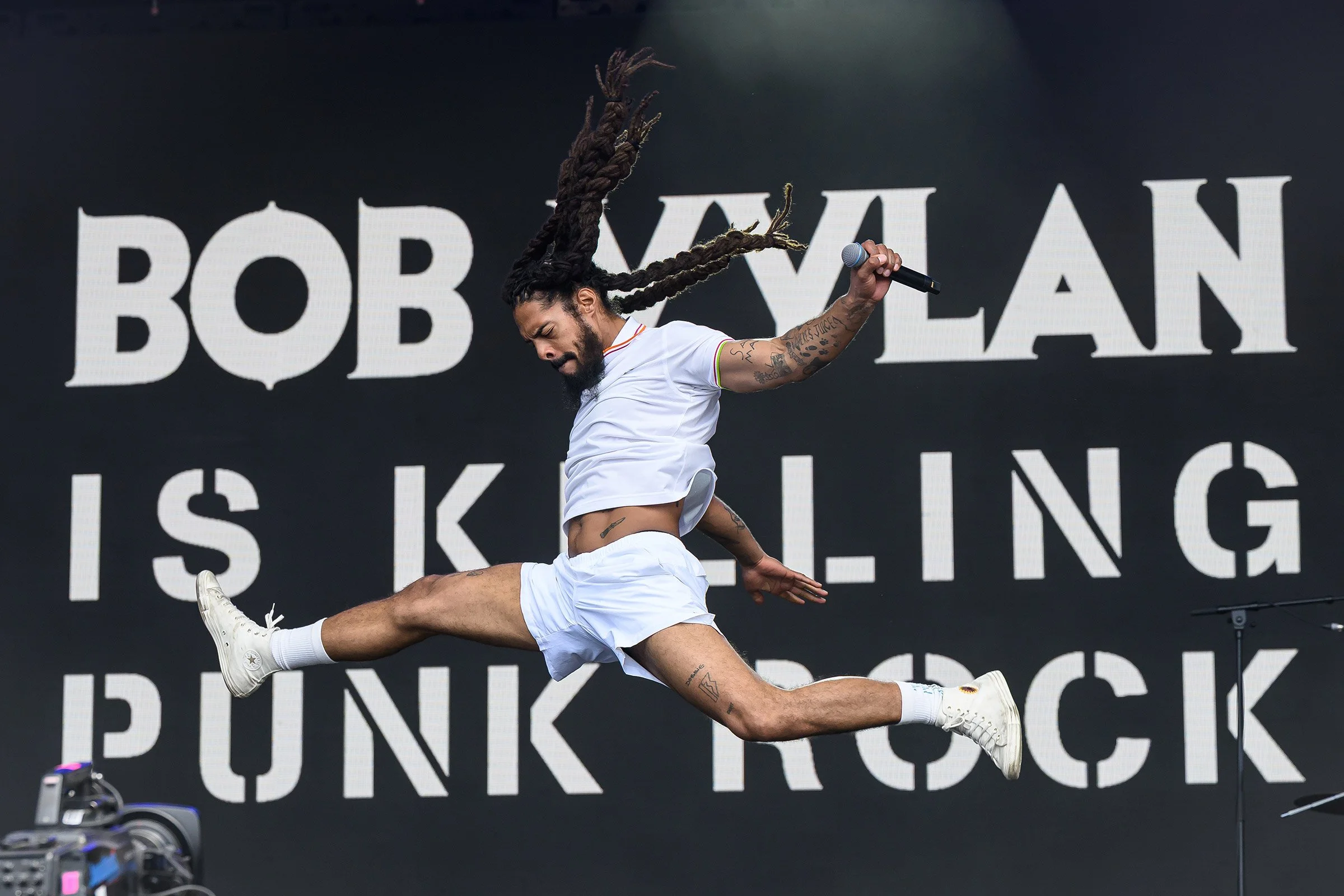 Looking at the bill for this year, I spotted that Bob Vylan were playing before Kneecap so while it was worth being at the stage early to try to beat the crowds, it would be a decent set of images, having enjoyed their set in previous years. Opening the set with the obligatory light stretches, Bobby Vylan (not to be confused with drummer Bobbie Vylan, of course) exploded into life, leaping around the stage, dreads flying, before crowd-surfing and even bringing his young daughter out for a cameo in the second song.